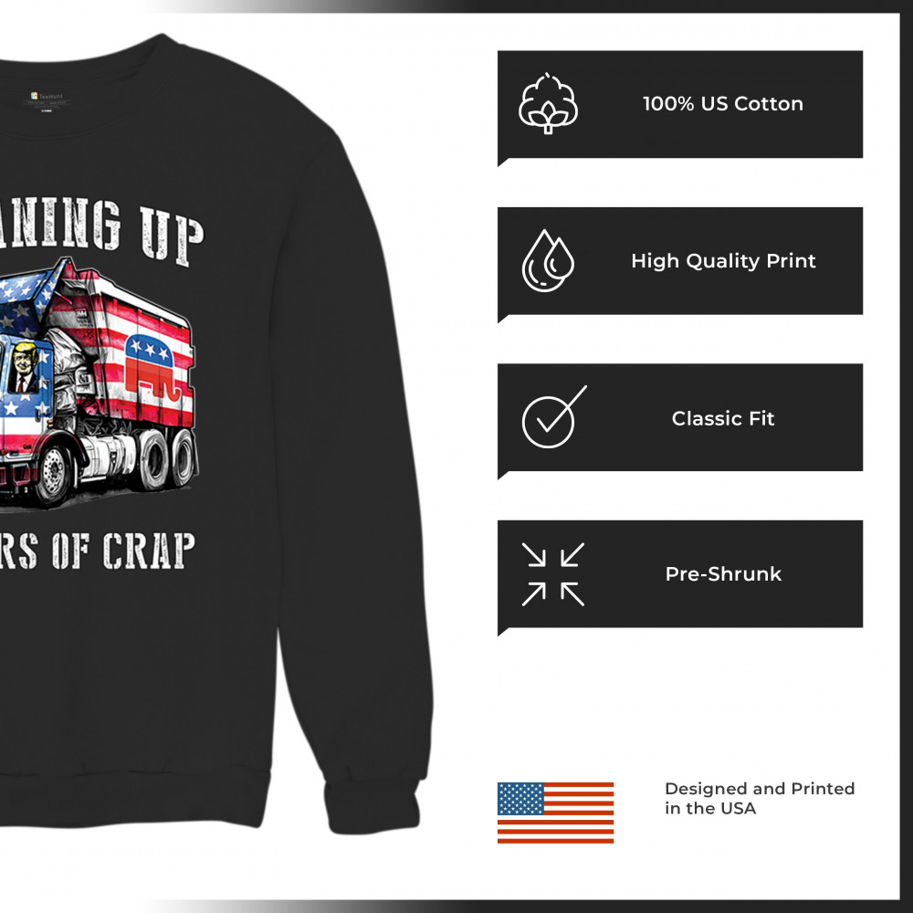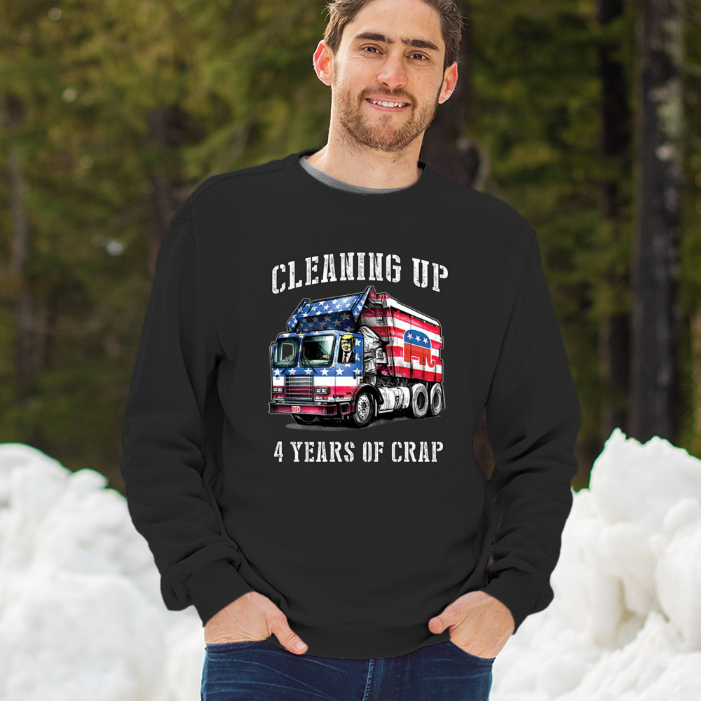 Bold "Cleaning Up 4 Years of Crap" design featuring Trump, the GOP, and the American flag. Perfect for proud conservatives and patriots.
