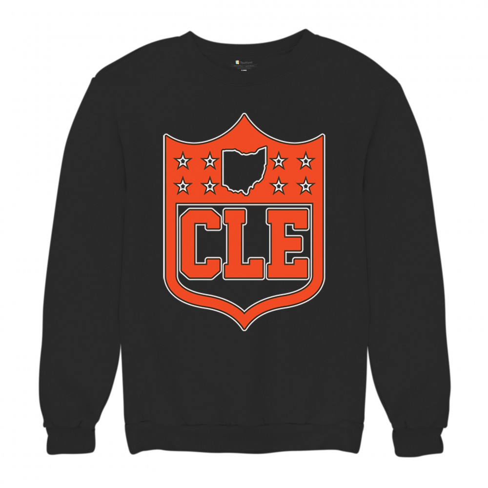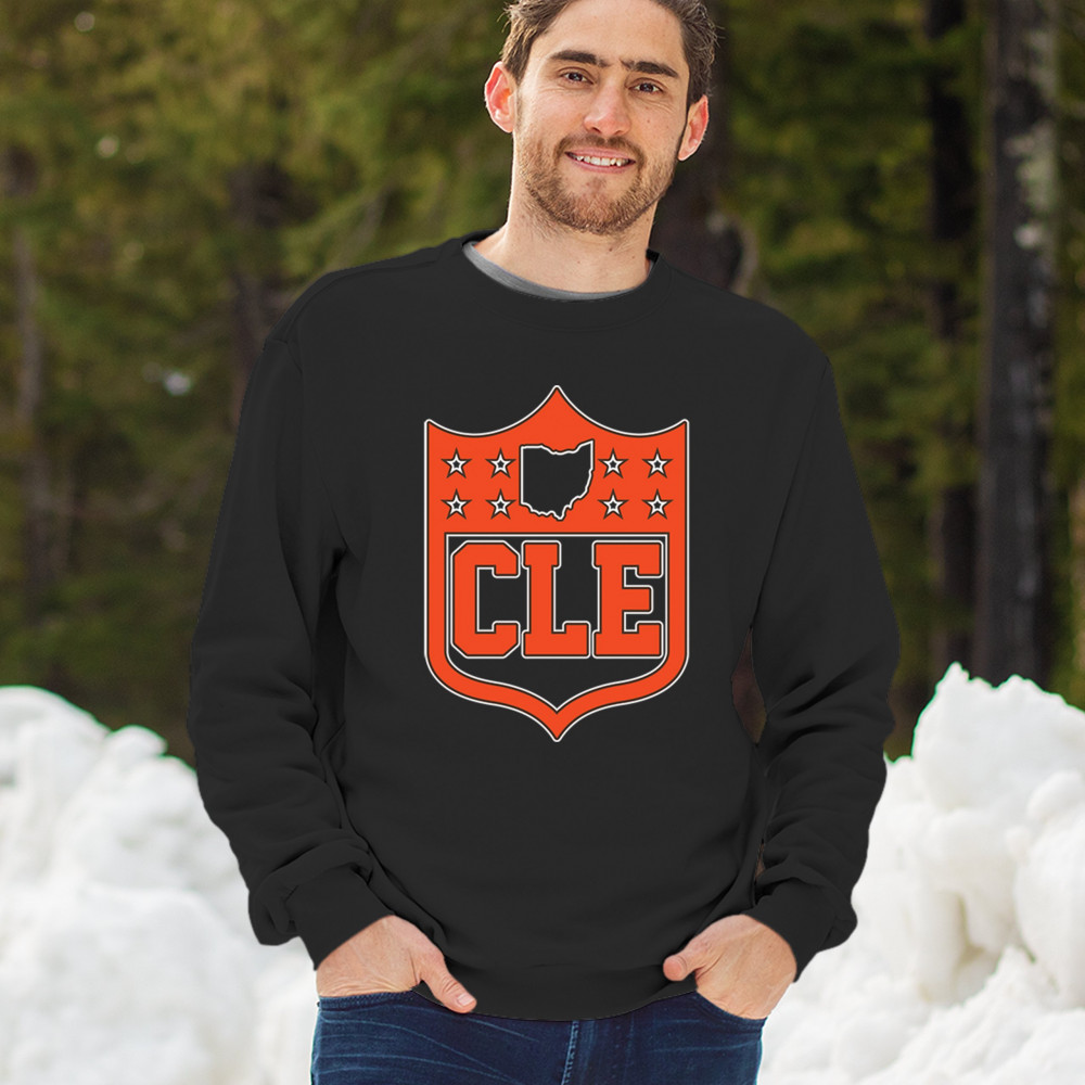 Bold CLE shield design honoring Cleveland football nation with Rust Belt pride, underdog grit, and blue collar sports heritage.