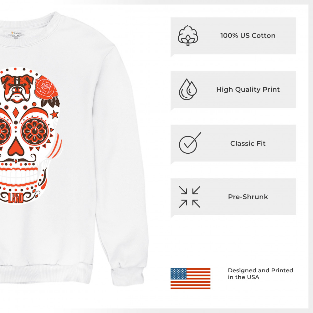 Cleveland Sugar Skull with Lake Erie pride, Rust Belt football grit, orange & brown tradition, playoff vibes, and Game Day passion.