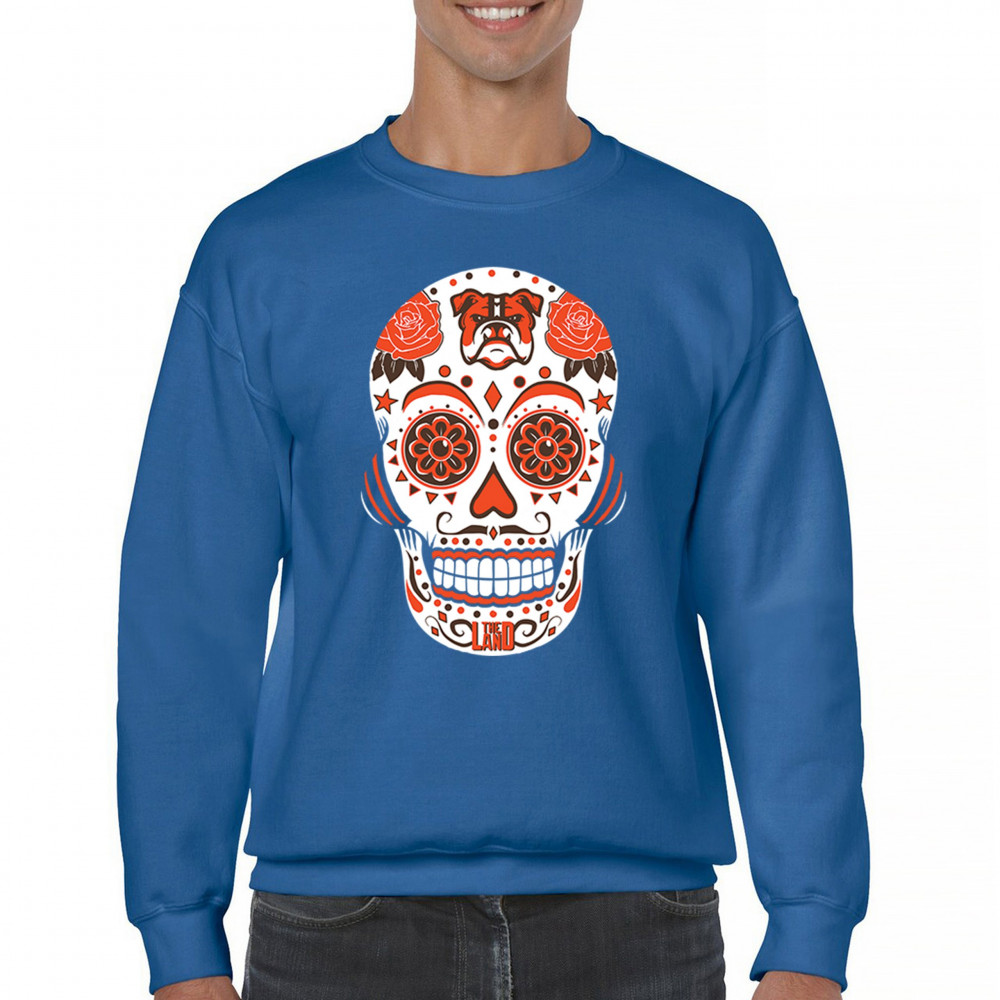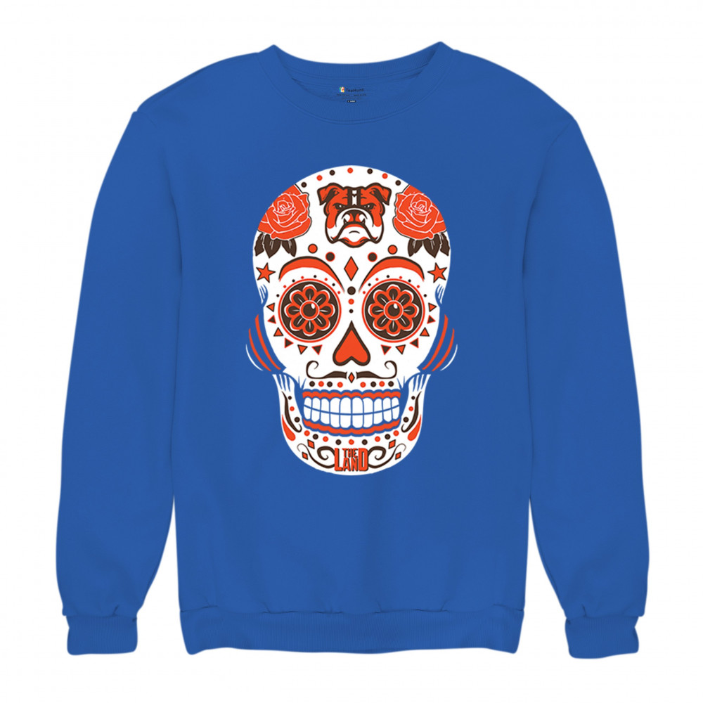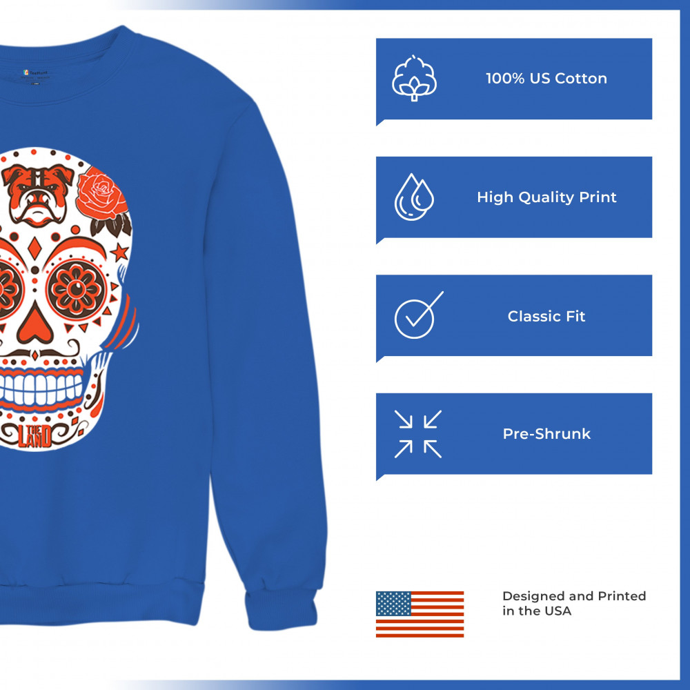 Cleveland Sugar Skull with Lake Erie pride, Rust Belt football grit, orange & brown tradition, playoff vibes, and Game Day passion.