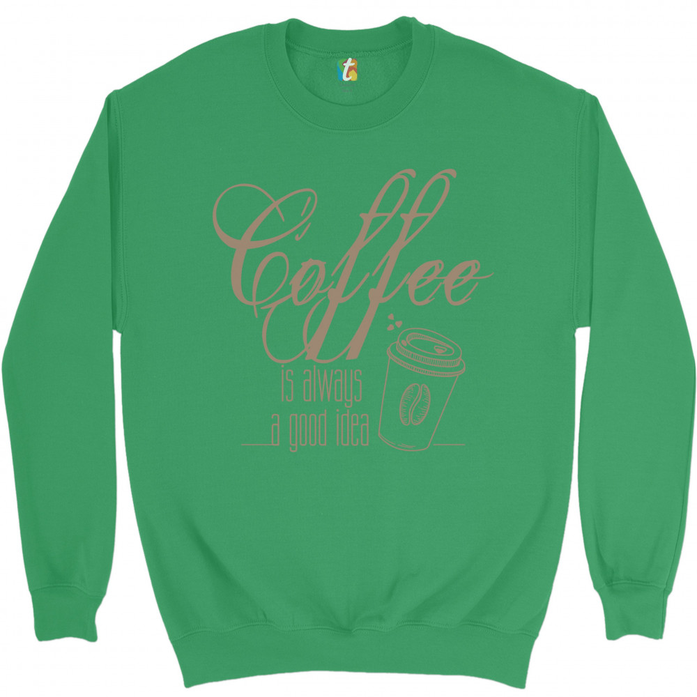 A print saying "Coffee is always a good idea". The print features a picture of a paper cup of tea with a coffee bean on it and with several hearts steaming from it. A great choice to wear to spread positive vibes and show what a passionate coffee fan you