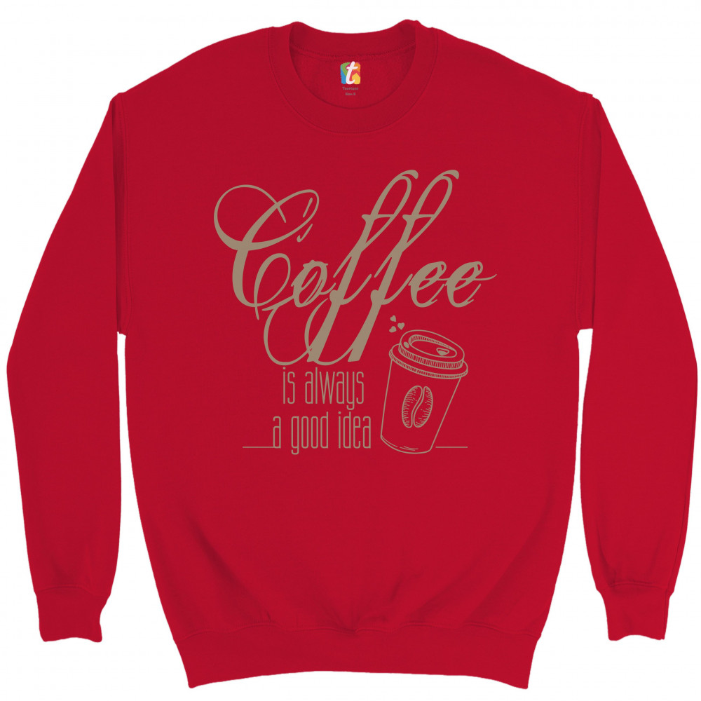 A print saying "Coffee is always a good idea". The print features a picture of a paper cup of tea with a coffee bean on it and with several hearts steaming from it. A great choice to wear to spread positive vibes and show what a passionate coffee fan you