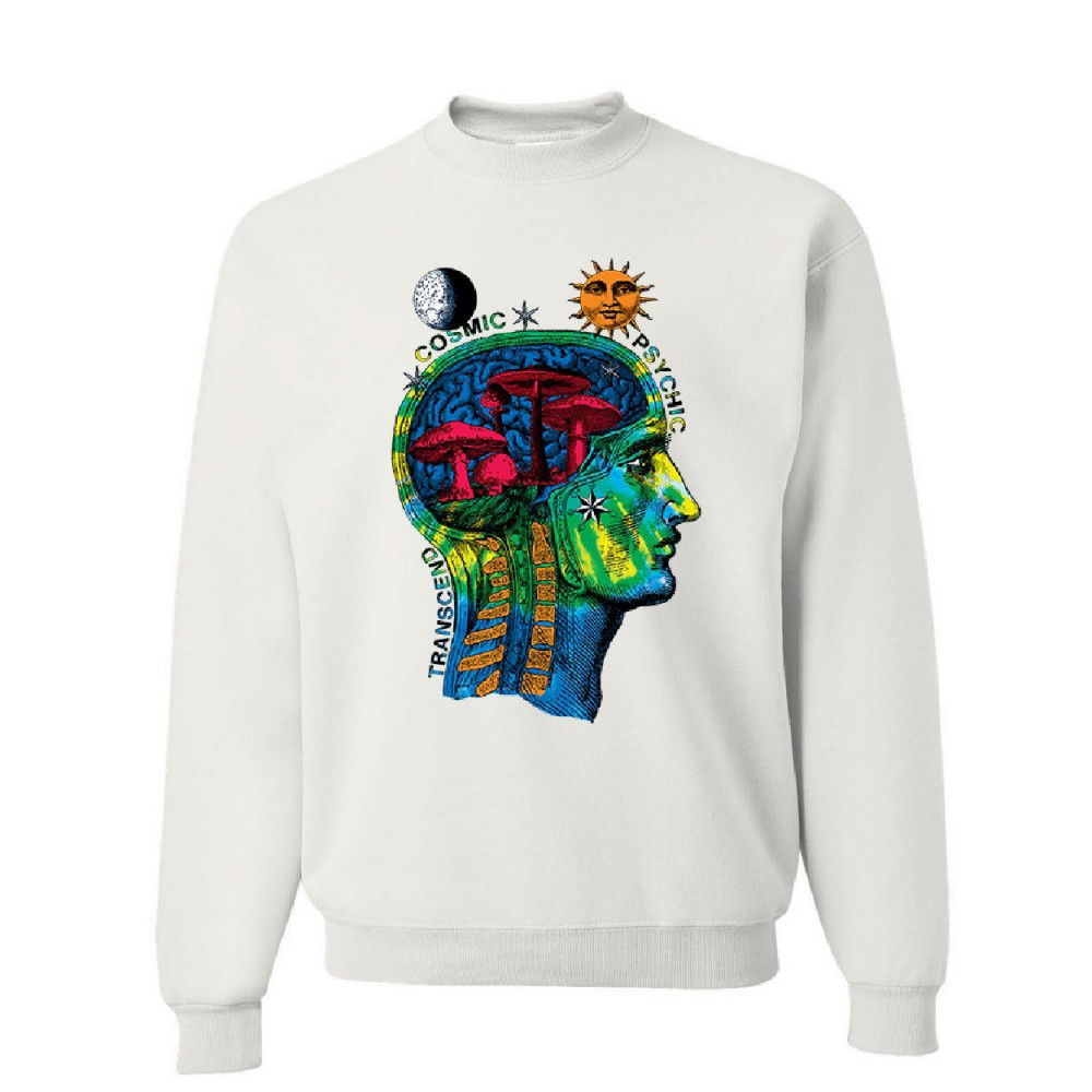 MUSHROOM HEAD cosmic psychic transcend sweatshirt psychedelic trippy weird space sweater white