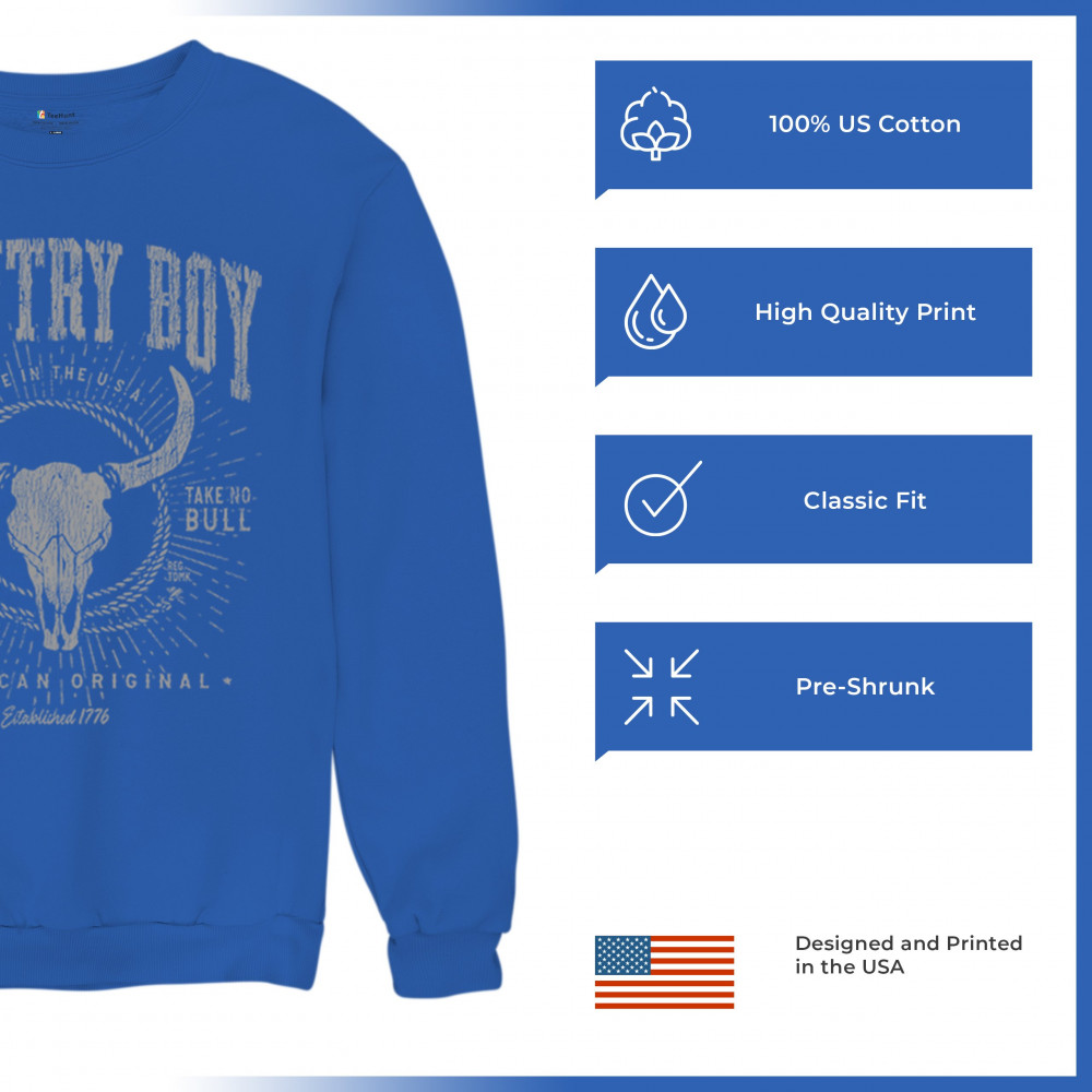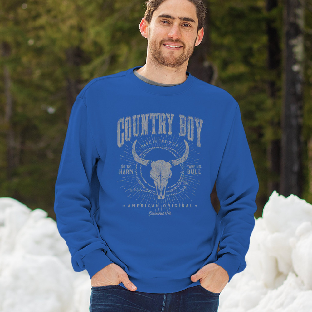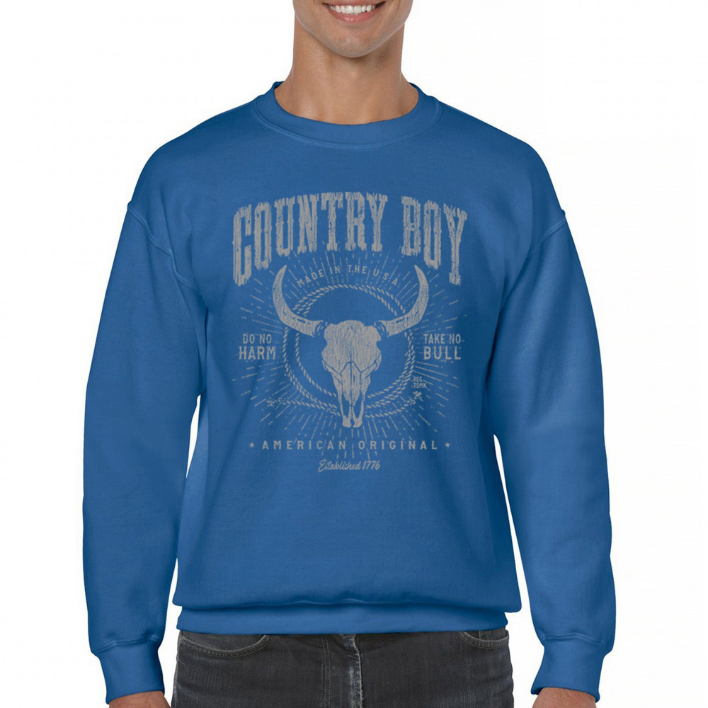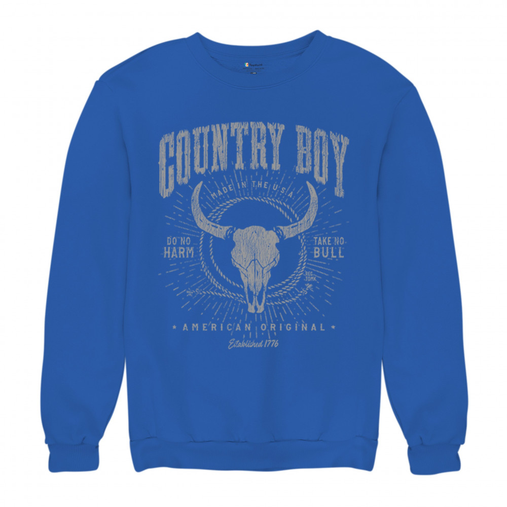 Bold country boy design with bull skull, distressed western style, patriotic grit, and the phrase “Do No Harm, Take No Bull.â€