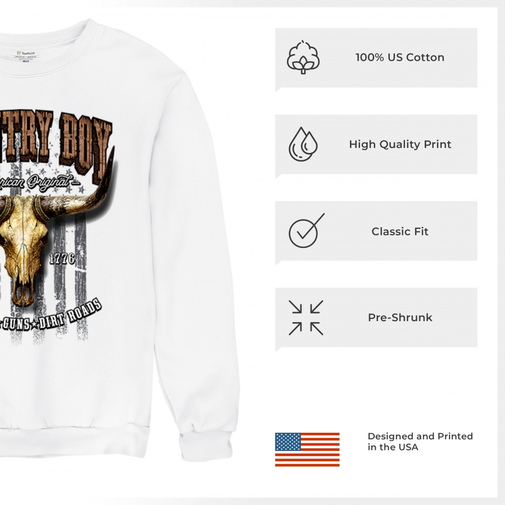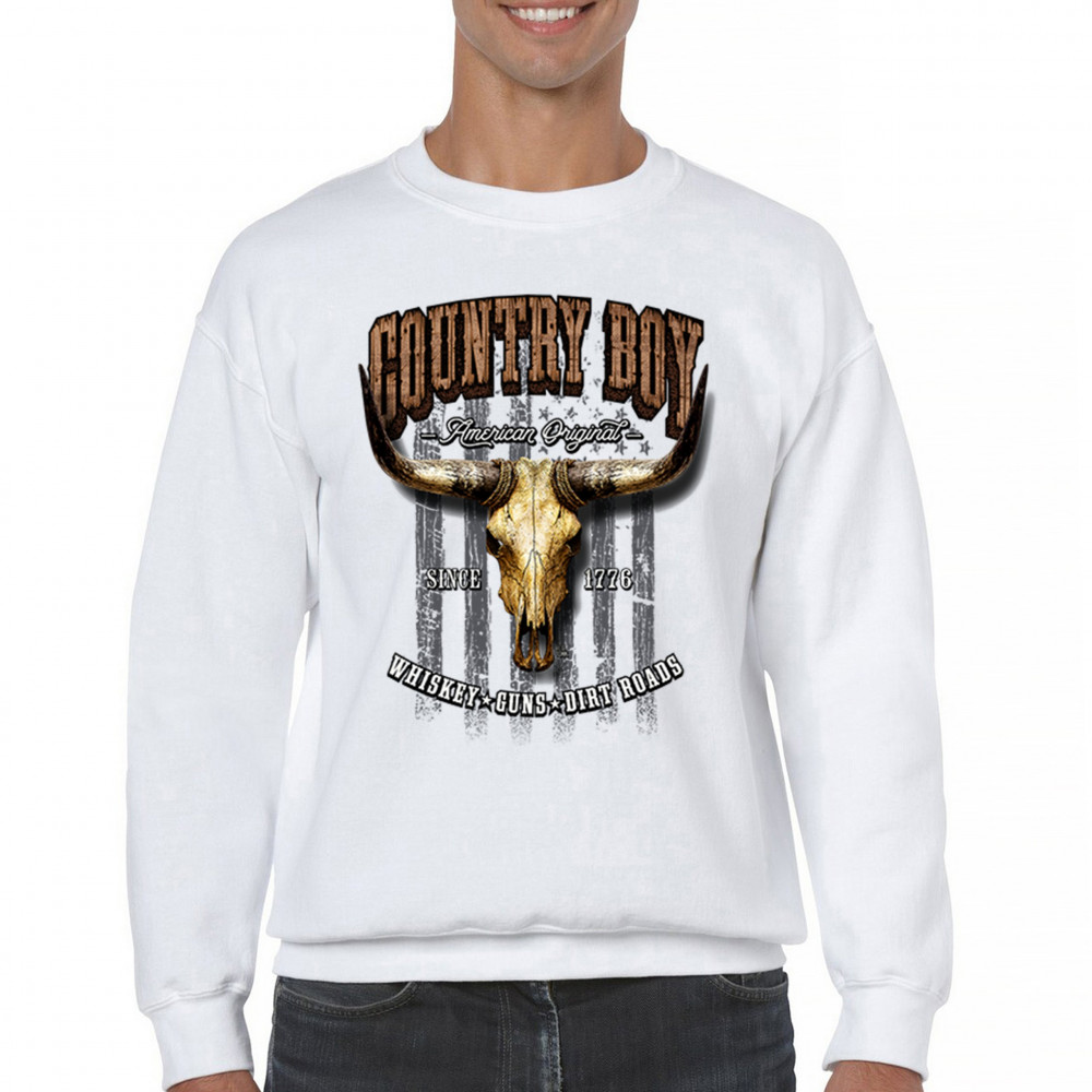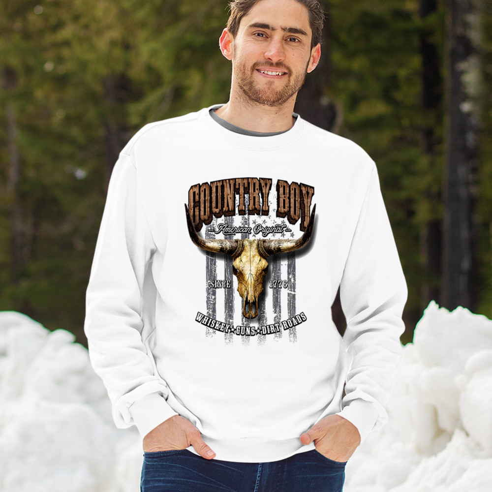 Country Boy – American Original. This bold western design captures the essence of southern living with a vintage bull skull, rustic lettering, and pride in whiskey, guns, and dirt roads. From 1776 to today, it honors the heritage of freedom-loving country men. Wear it to rodeos, bonfires, or muddy trails.