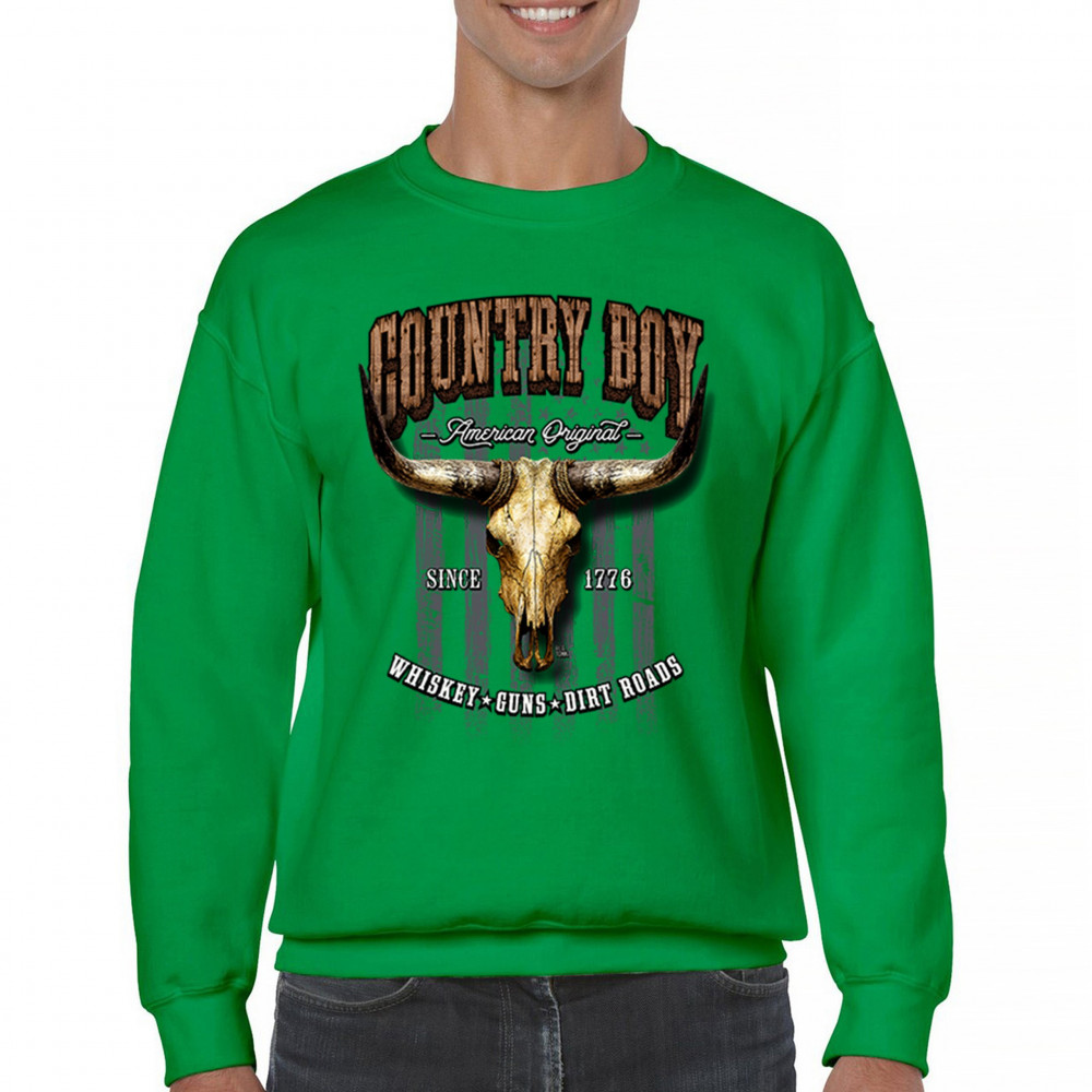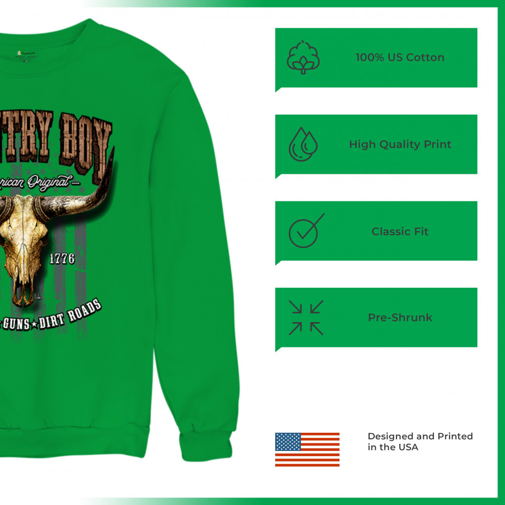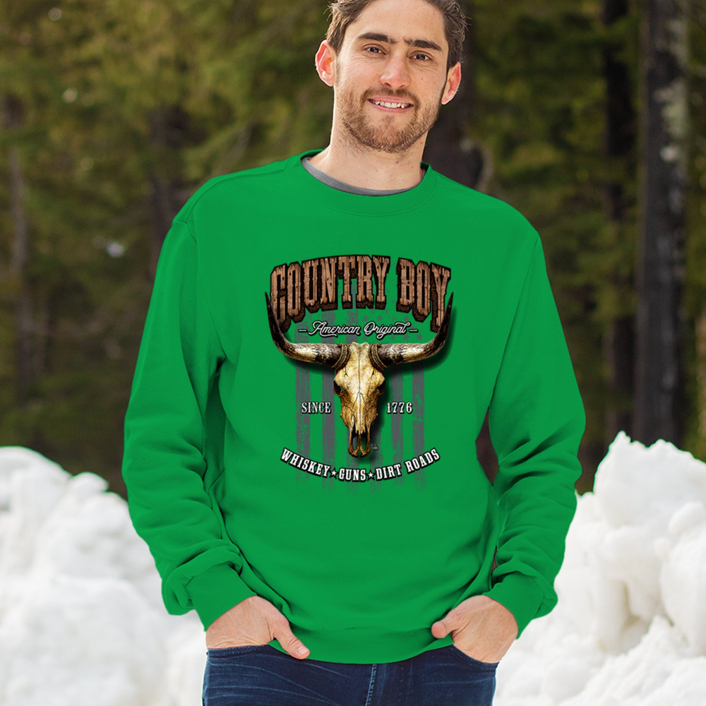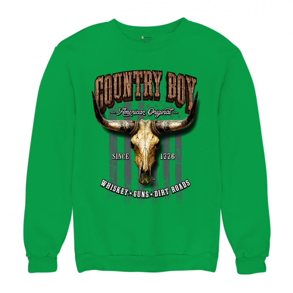 Country Boy – American Original. This bold western design captures the essence of southern living with a vintage bull skull, rustic lettering, and pride in whiskey, guns, and dirt roads. From 1776 to today, it honors the heritage of freedom-loving country men. Wear it to rodeos, bonfires, or muddy trails.