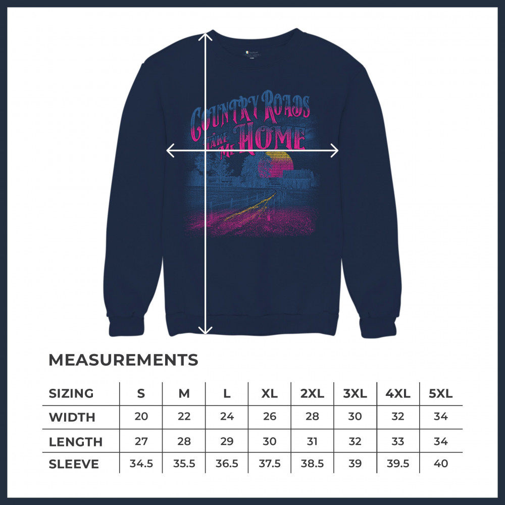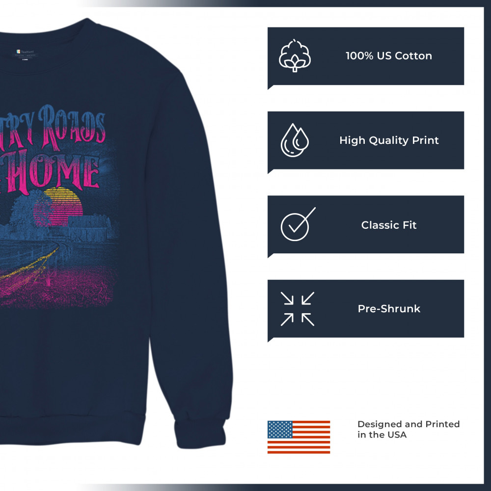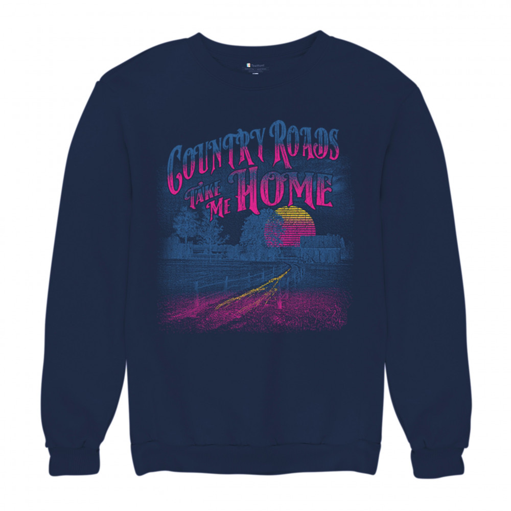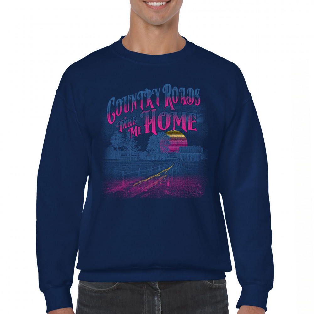 Retro sunset "Country Roads Take Me Home" design for road trip lovers, Americana fans, and country music souls. Bright, bold, and nostalgic.