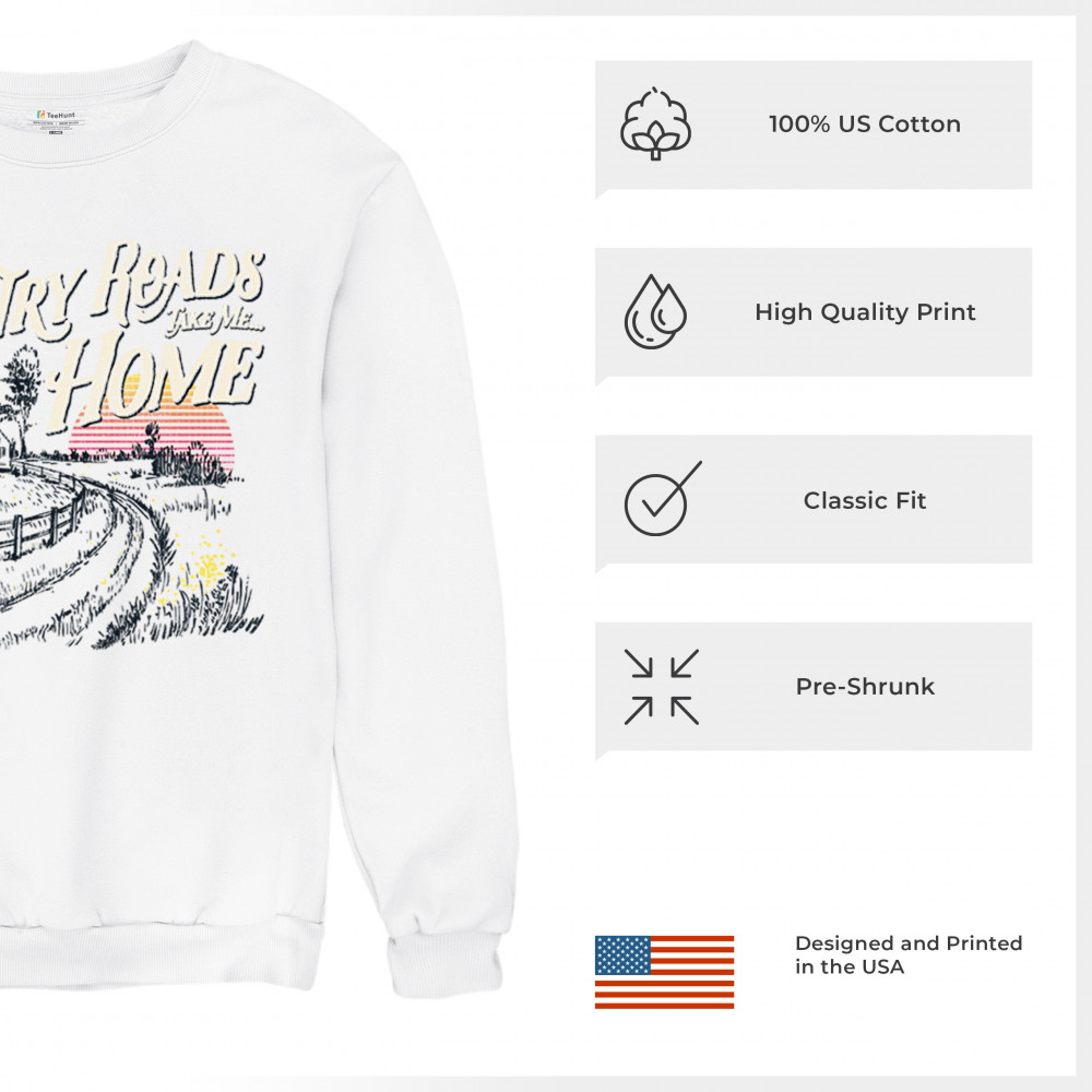 Celebrate your love for small town charm and scenic drives with this nostalgic country roads design. Featuring a bold "Take Me Home" message over a retro-styled sunset, it’s ideal for road trips, summer nights, fairs, concerts, and rural adventures. Let your wanderlust and country soul shine in every mile.