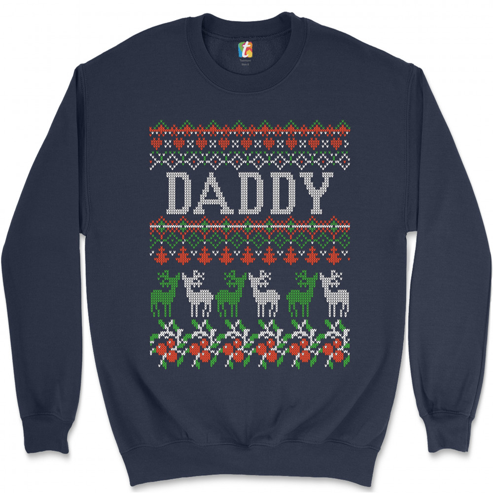 A print saying: "Daddy" and featuring six reindeers. The print is designed as an ugly sweater. Amazing choice to make people smile and spread positive vibes on Christmas Eve.