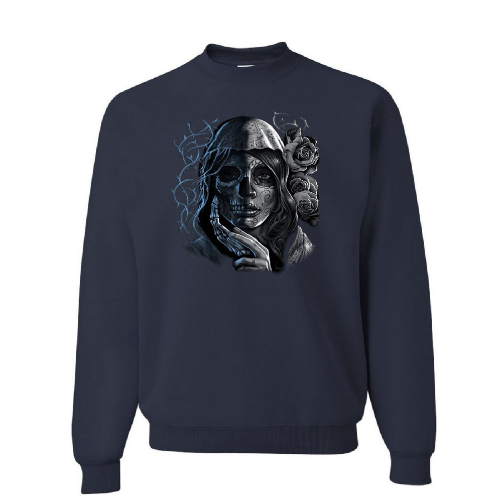 DEAD GIRL WITH ROSES sweatshirt sugar skull face day of the dead sweater navy blue