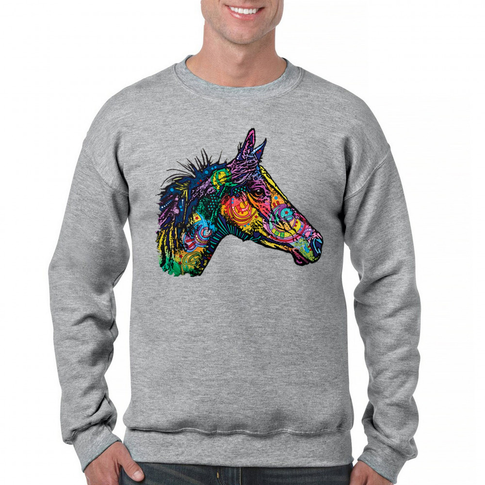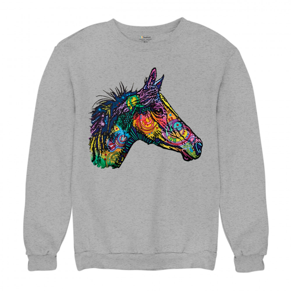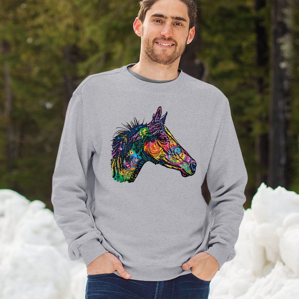 DEAN RUSSO COLORFUL HORSE sweatshirt neon mosaic wild mustang animal crewneck gray