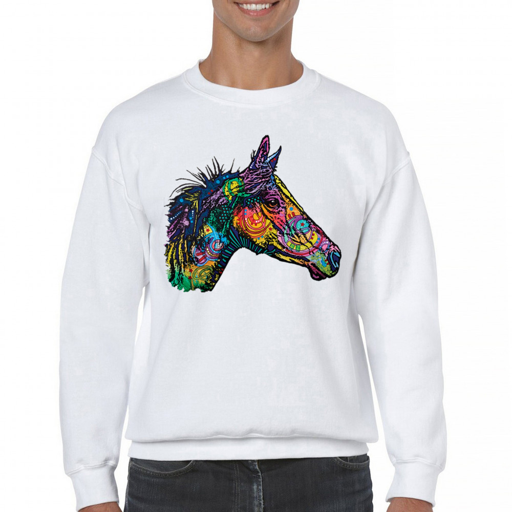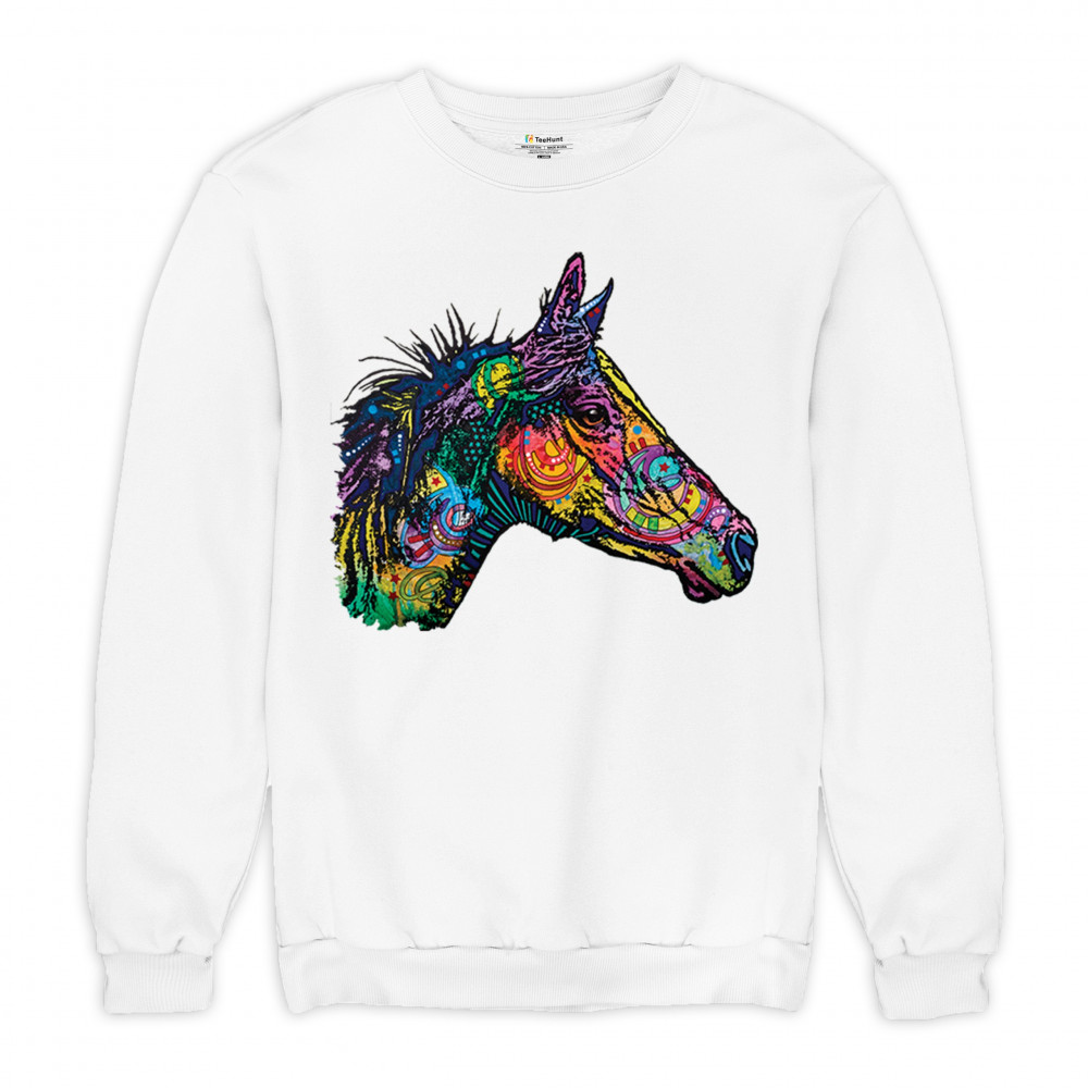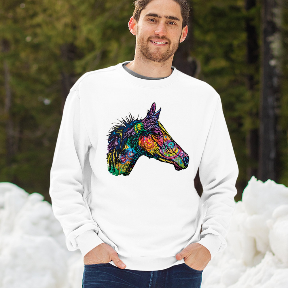 DEAN RUSSO COLORFUL HORSE sweatshirt neon mosaic wild mustang animal crewneck white