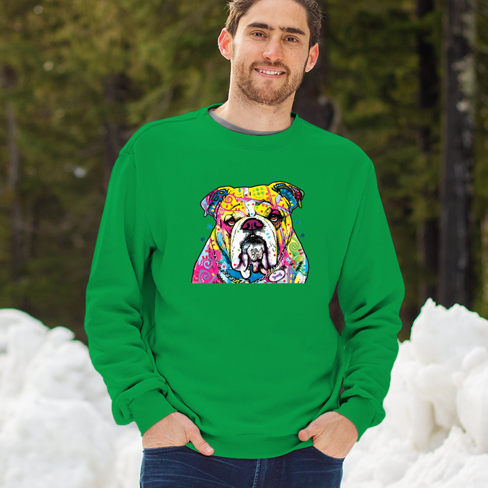 DEAN RUSSO SERIOUS BULLDOG sweatshirt colorful dog best friend crewneck green