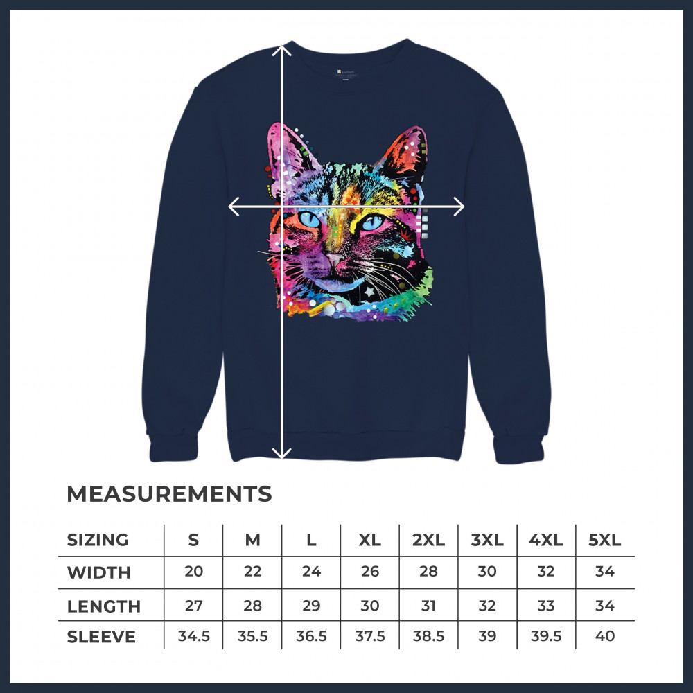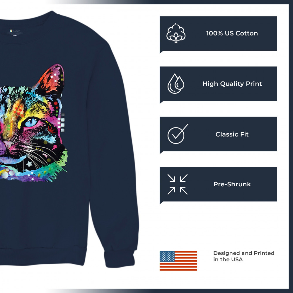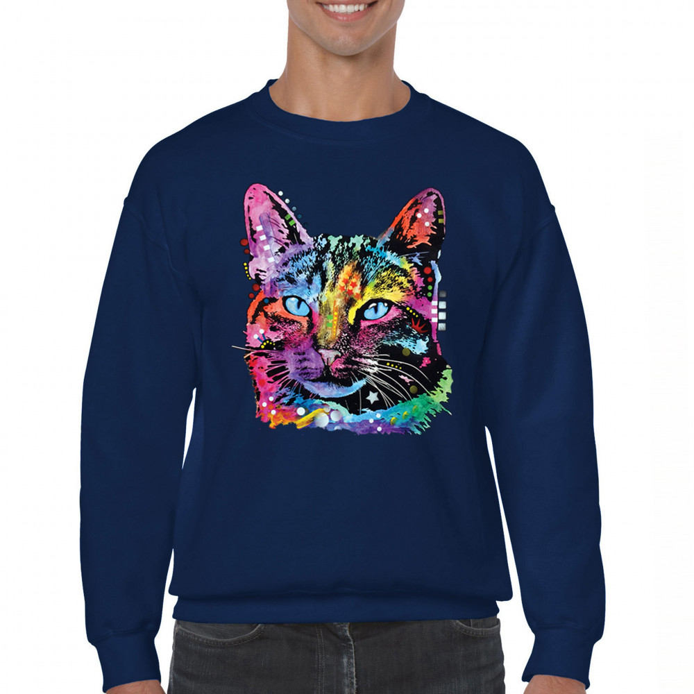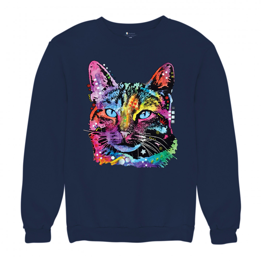 DEAN RUSSO THOUGHTFUL CAT sweatshirt colorful pet kitten eyes crewneck navy blue