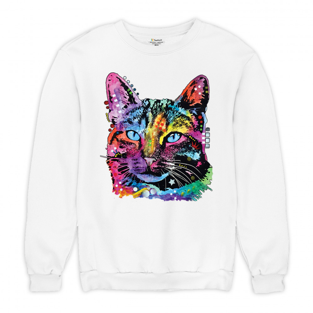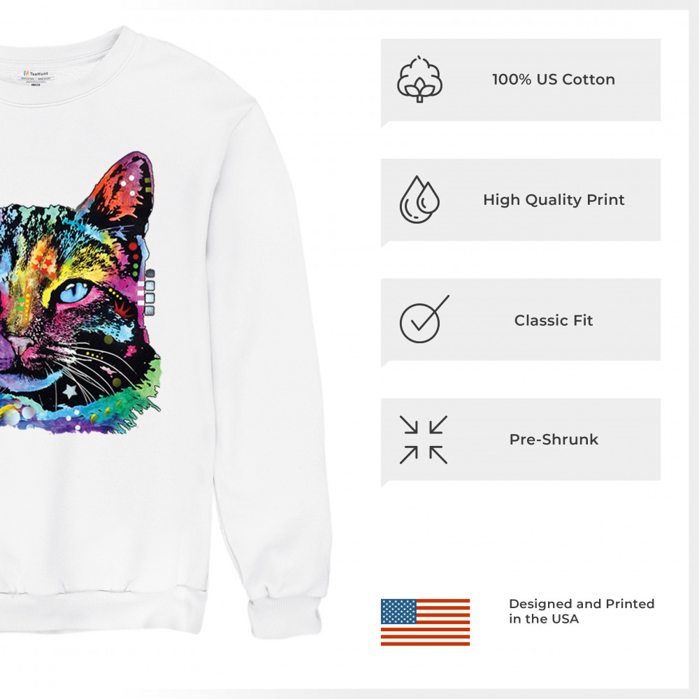 DEAN RUSSO THOUGHTFUL CAT sweatshirt colorful pet kitten eyes crewneck white