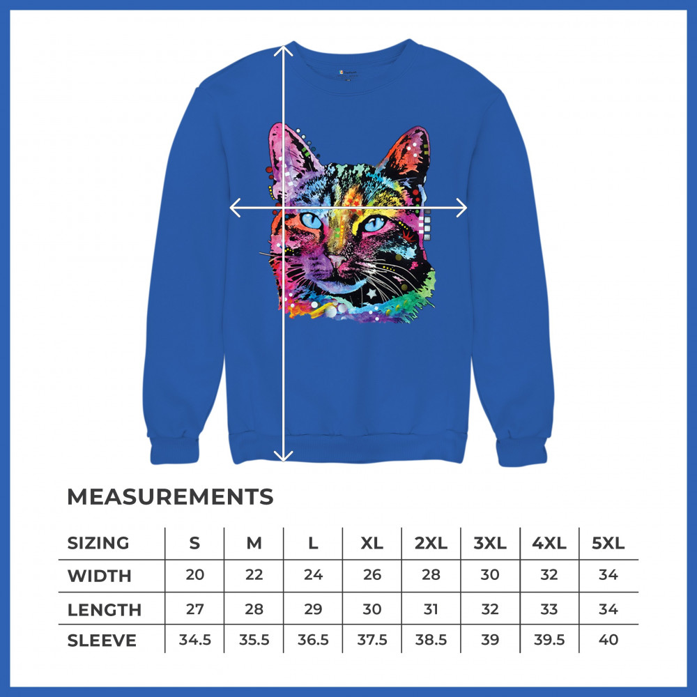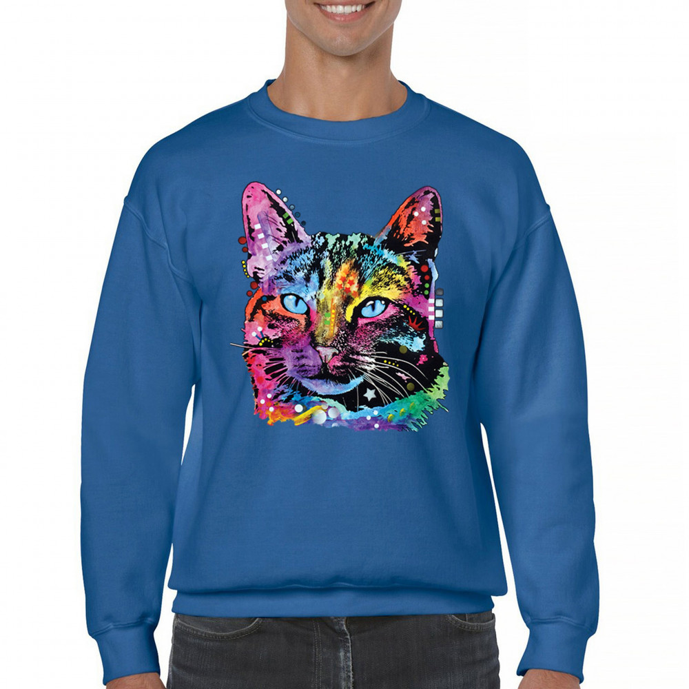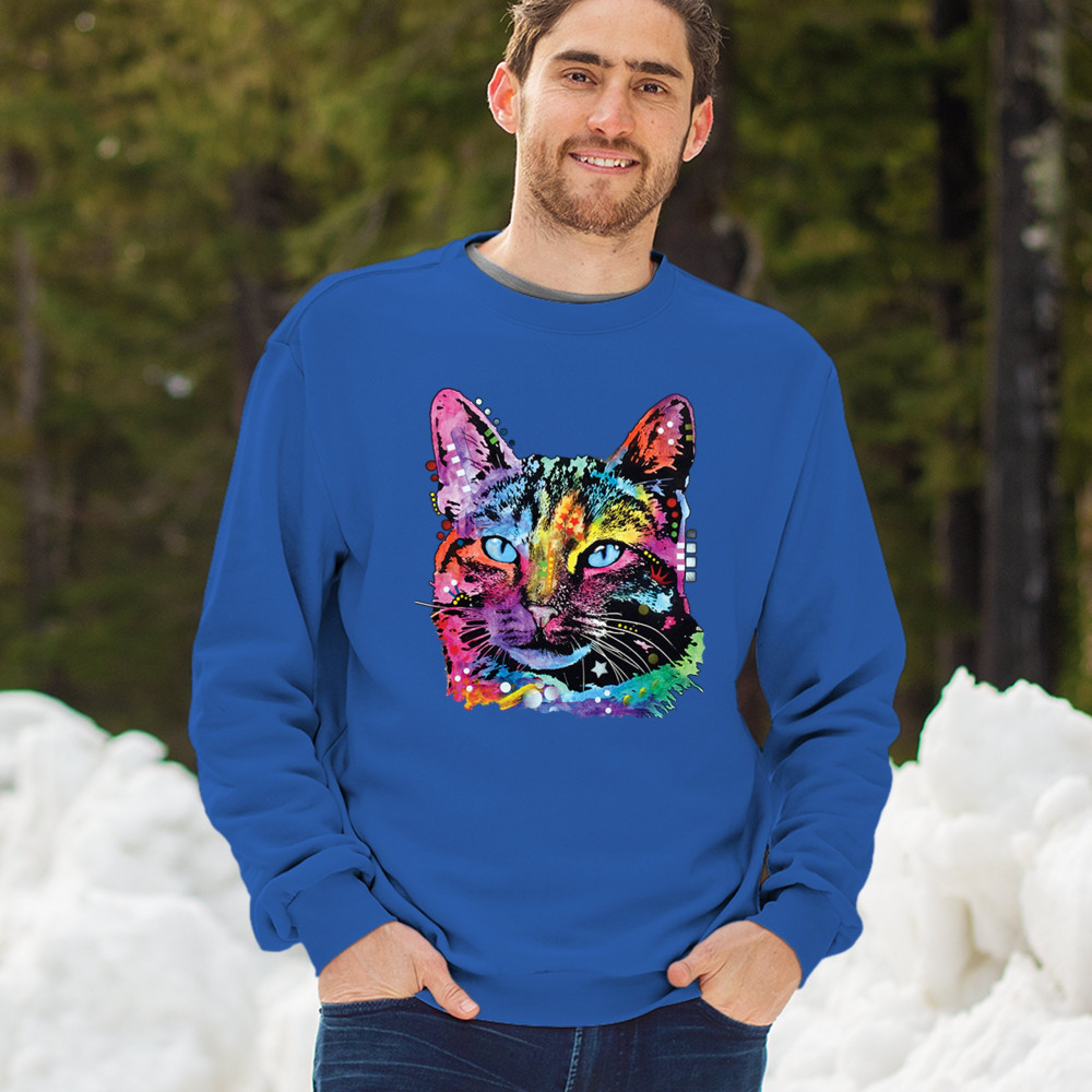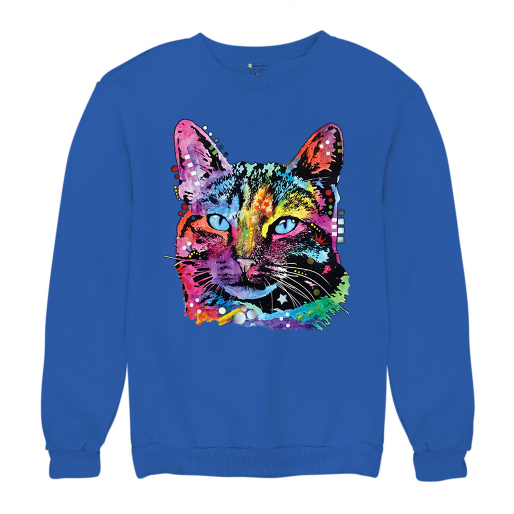 DEAN RUSSO THOUGHTFUL CAT sweatshirt colorful pet kitten eyes crewneck royal blue