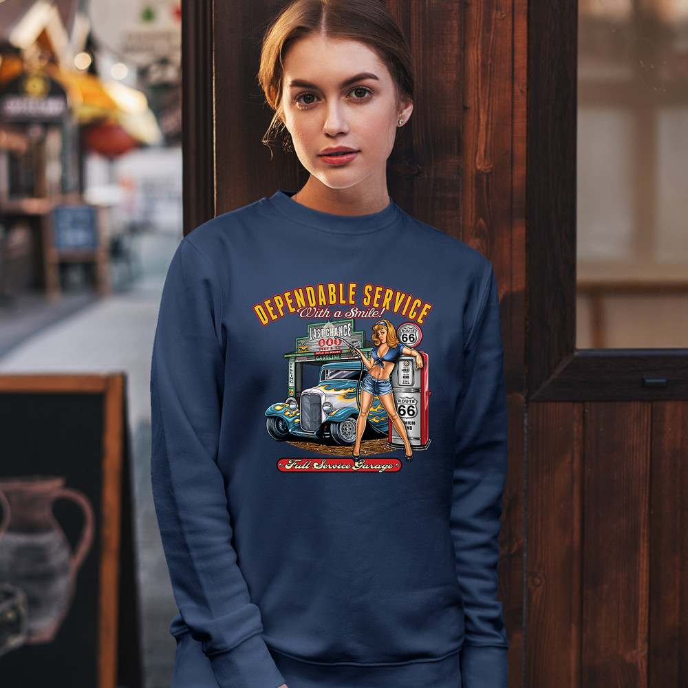 DEPENDABLE SERVICE sweatshirt route 66 hot rod full service garage crewneck navy blue