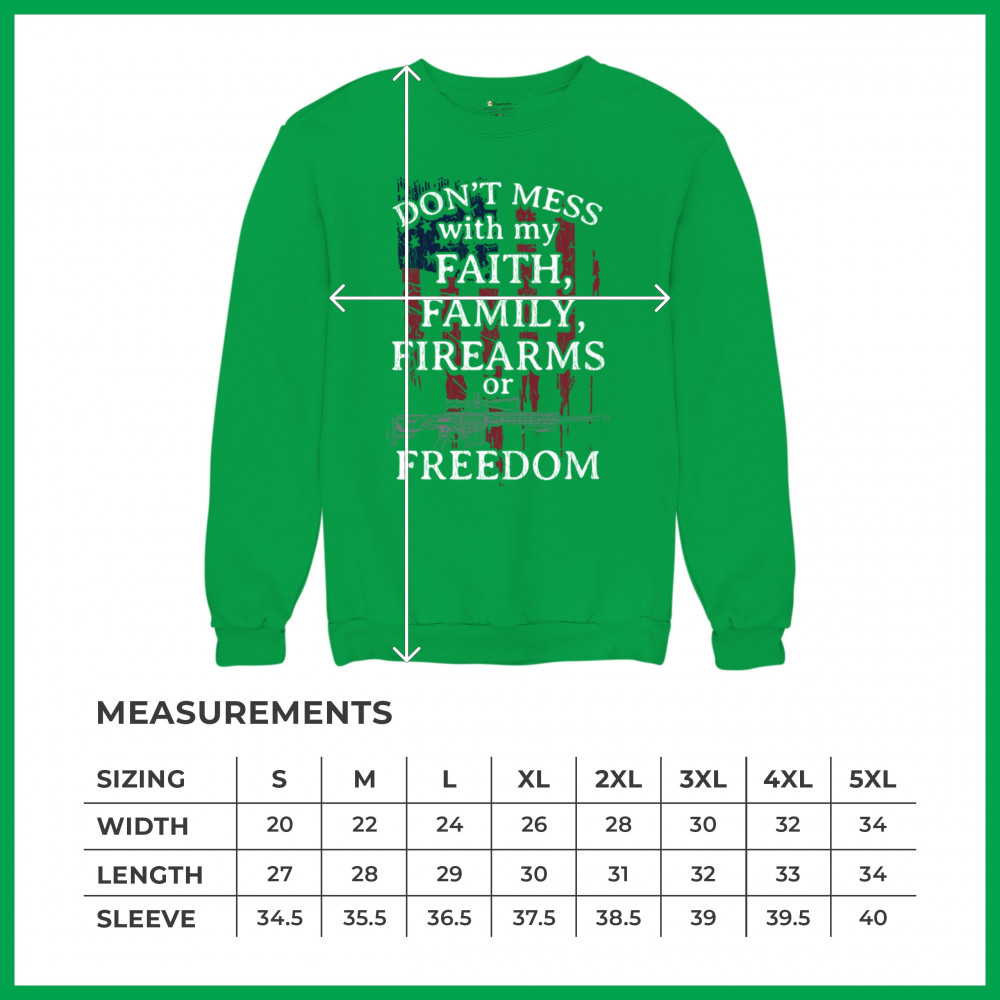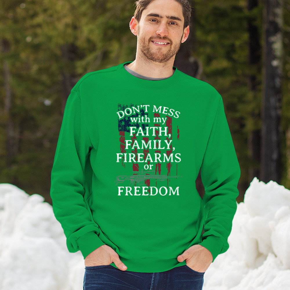 Celebrate your patriotism and core values with this powerful shirt featuring "Don't Mess with My Faith, Family, Firearms, or Freedom" set against a distressed American flag. This shirt is perfect for patriots, veterans, and those who hold their religious beliefs and the right to bear arms in high regard. Made from high-quality fabric, it ensures comfort and durability for everyday wear. Wear it proudly at patriotic events, on the 4th of July, or anytime you want to make a strong statement about your beliefs. It’s an excellent gift for anyone who shares these values and supports the American flag and the stars and stripes.