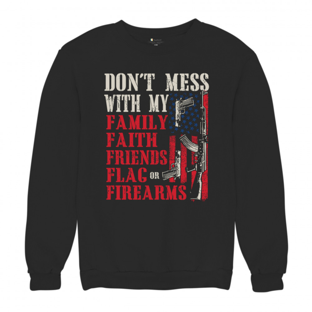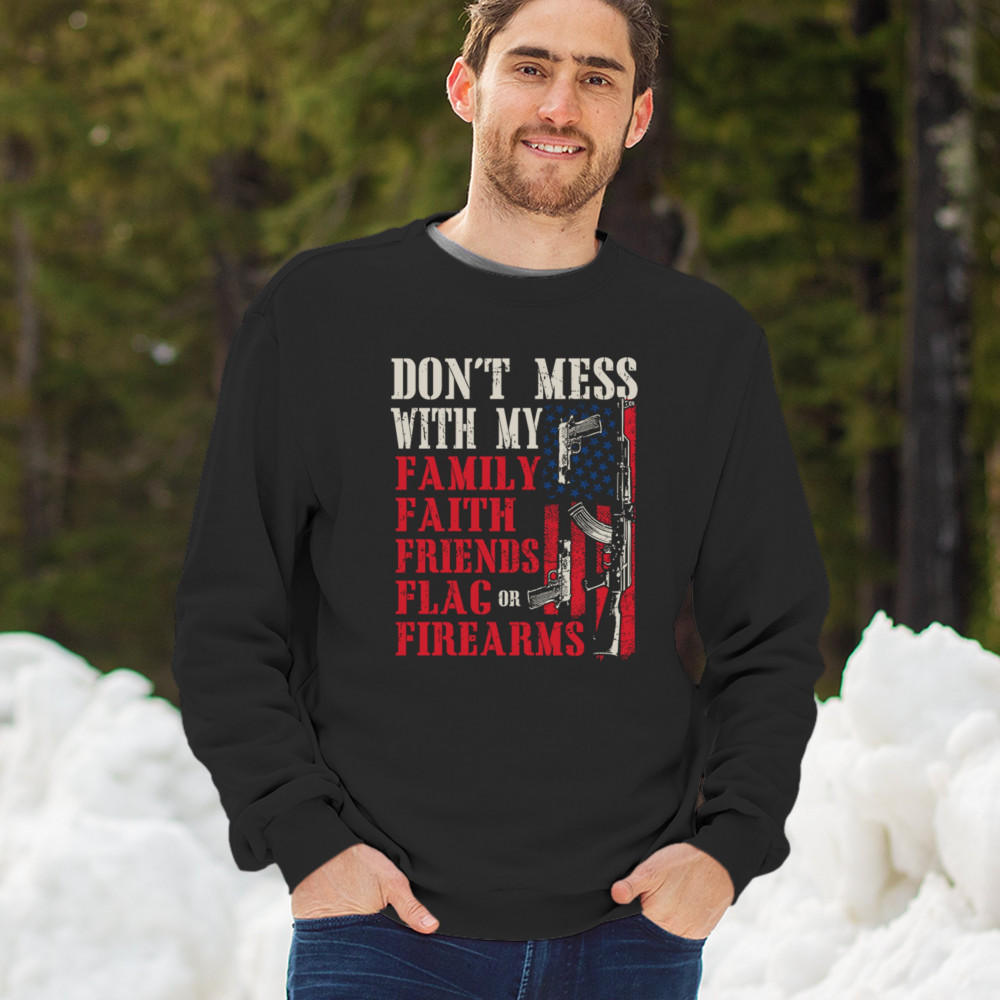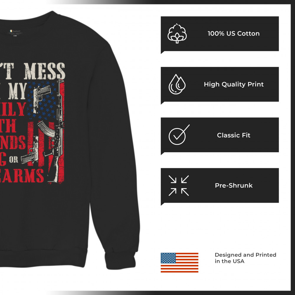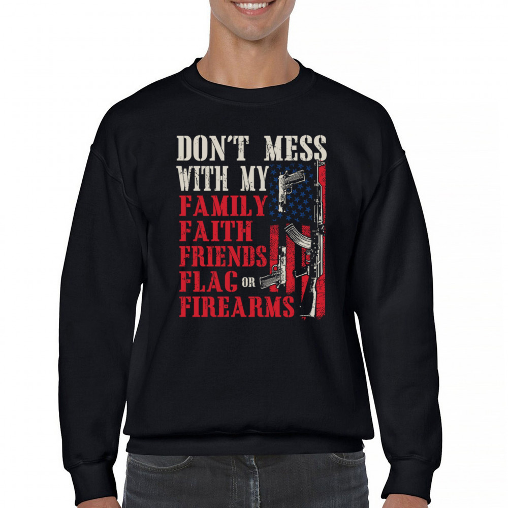 Patriotic design for gun owners and liberty-lovers. Bold message defends family, flag, and firearms with unapologetic American pride.
