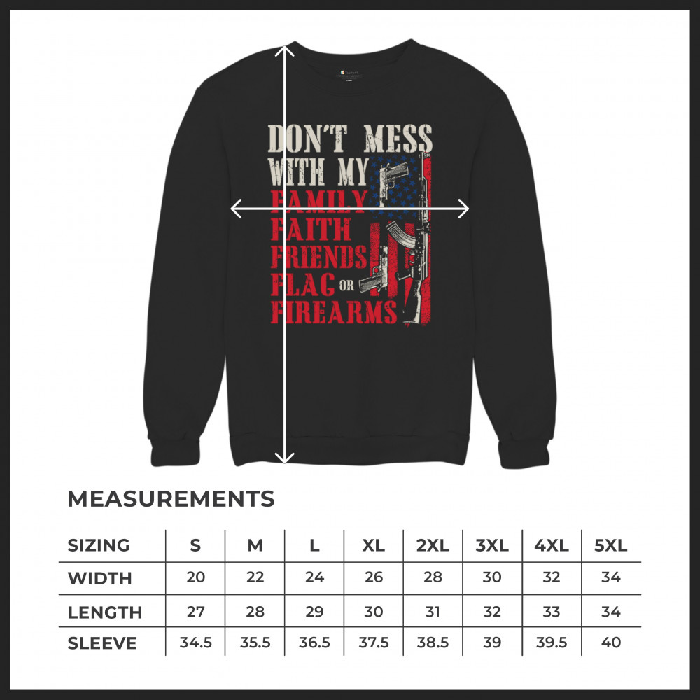 Don’t mess with a patriot’s core. This powerful design shouts loyalty to family, faith, friends, flag, and firearms. Featuring bold lettering on an American flag backdrop, it’s made for defenders of freedom, gun rights, and American values. Ideal for veterans, 2A supporters, and anyone who won’t back down from defending what they love.