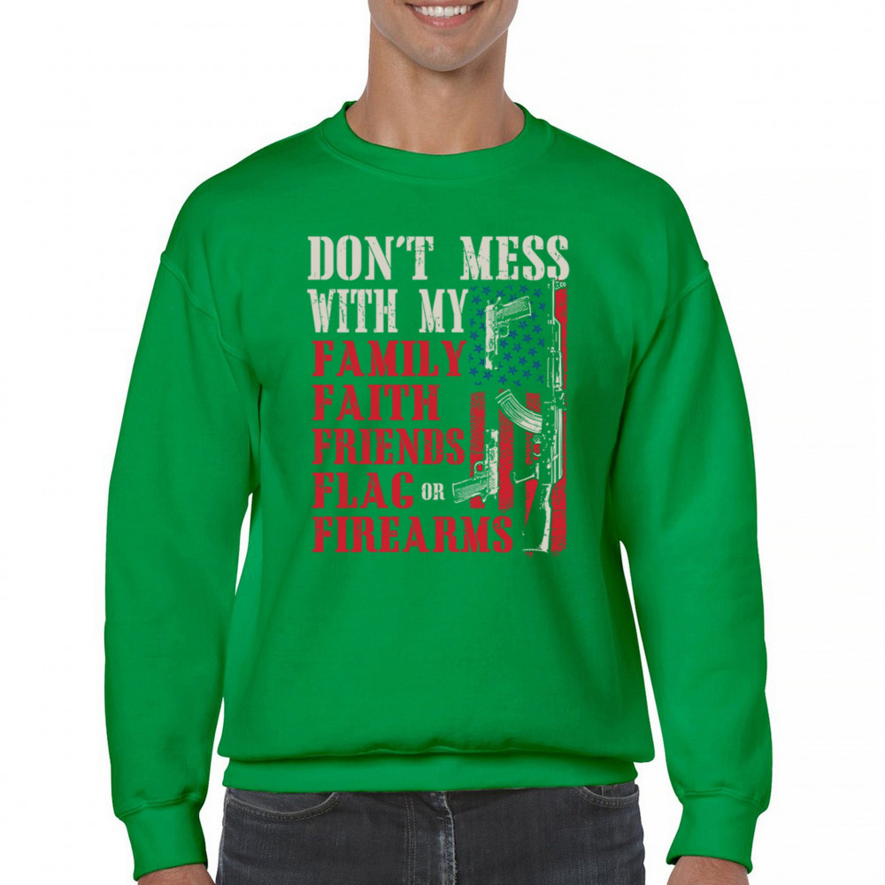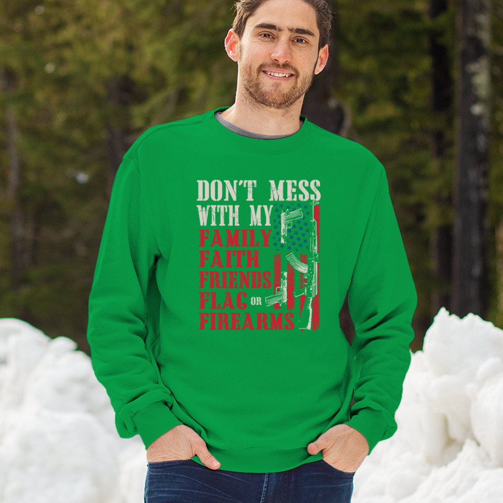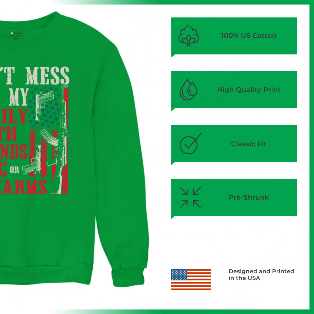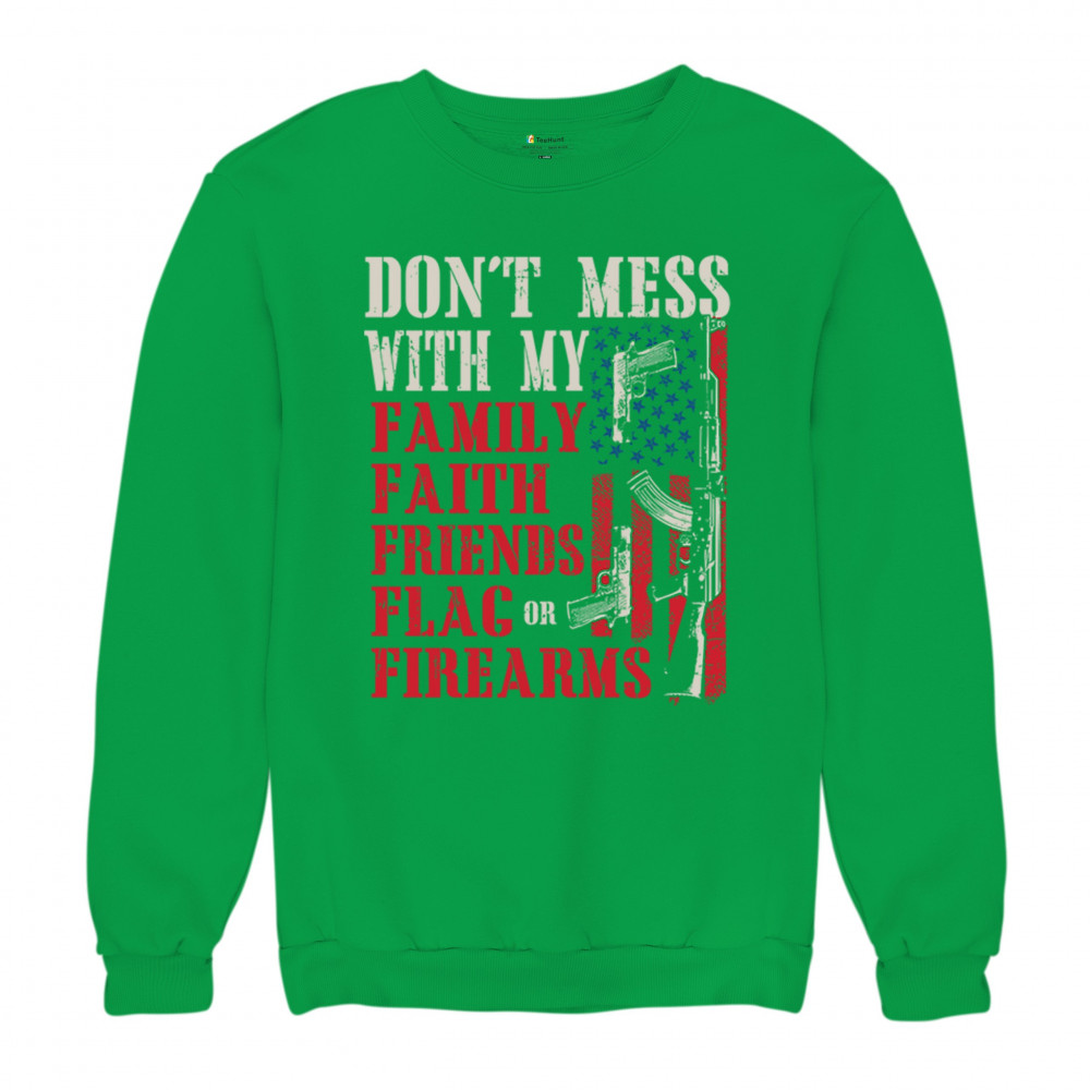 Patriotic design for gun owners and liberty-lovers. Bold message defends family, flag, and firearms with unapologetic American pride.