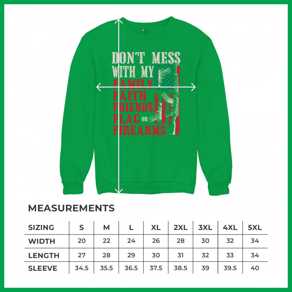 Don’t mess with a patriot’s core. This powerful design shouts loyalty to family, faith, friends, flag, and firearms. Featuring bold lettering on an American flag backdrop, it’s made for defenders of freedom, gun rights, and American values. Ideal for veterans, 2A supporters, and anyone who won’t back down from defending what they love.