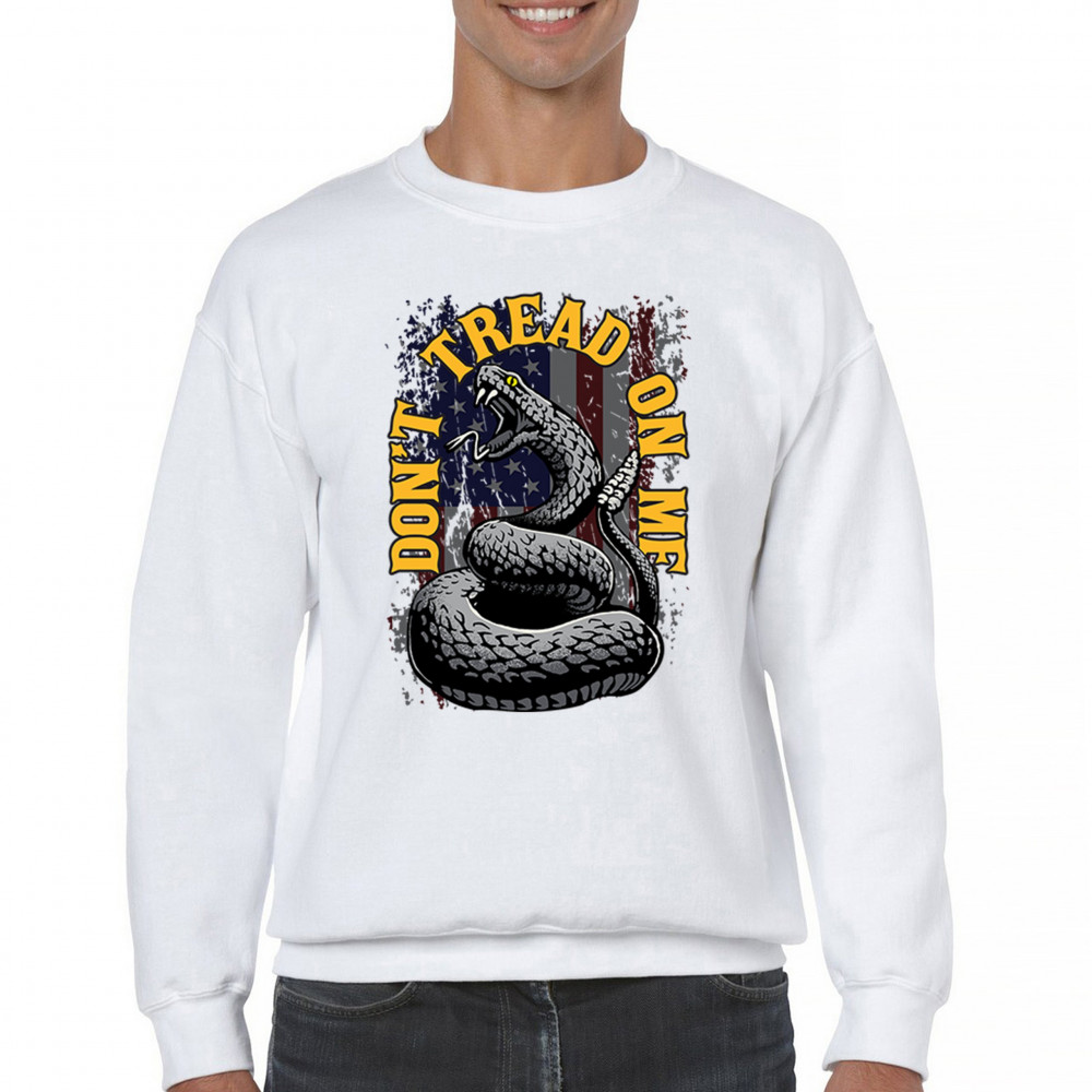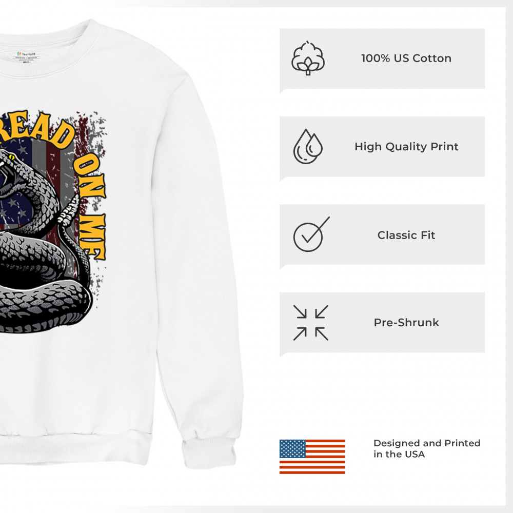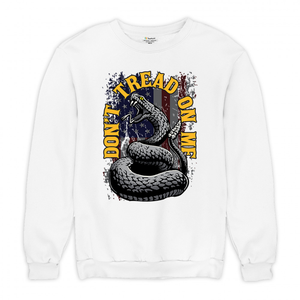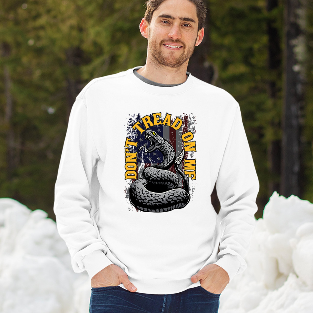 Bold "Don't Tread on Me" design with snake and American flag. Ideal for patriots. Show your love for freedom and independence.