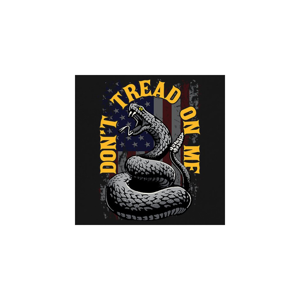 Bold "Don't Tread on Me" design with snake and American flag. Ideal for patriots. Show your love for freedom and independence.