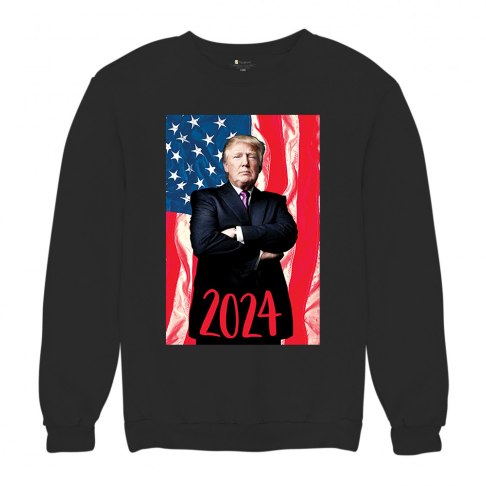 Showcase your unwavering support and patriotic pride with our exclusive design, featuring Donald Trump poised before the American flag with "2024" inscribed below. This powerful imagery is a testament to the conservative journey towards victory, echoing the calls of "America First" and unity under a common cause. It's a tribute to those who believe in standing firm, fueled by trust in God and a commitment to the principles that define us. A must-have for every supporter ready to be part of the next chapter in American history.