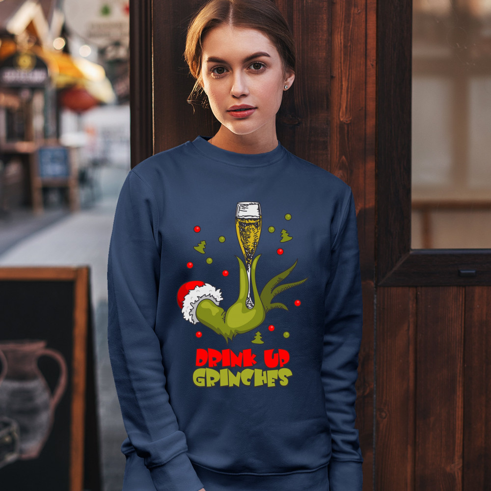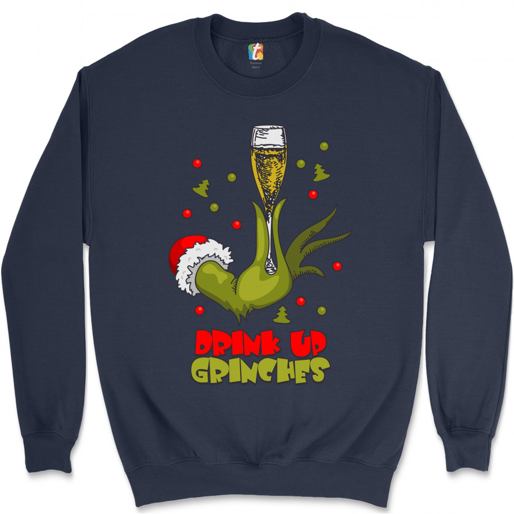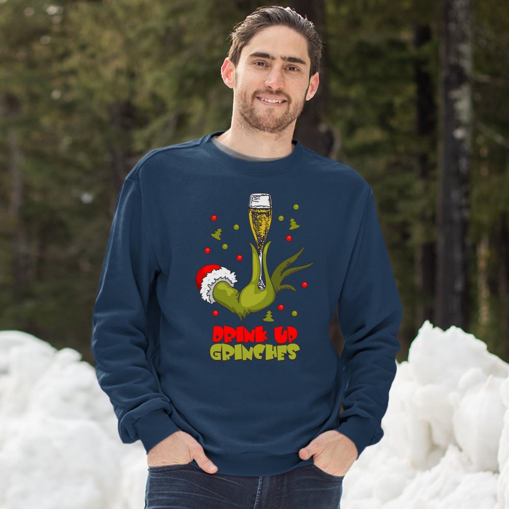 DRINK UP GRINCHES sweatshirt funny christmas drinking crewneck navy blue