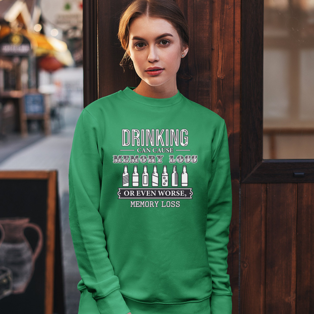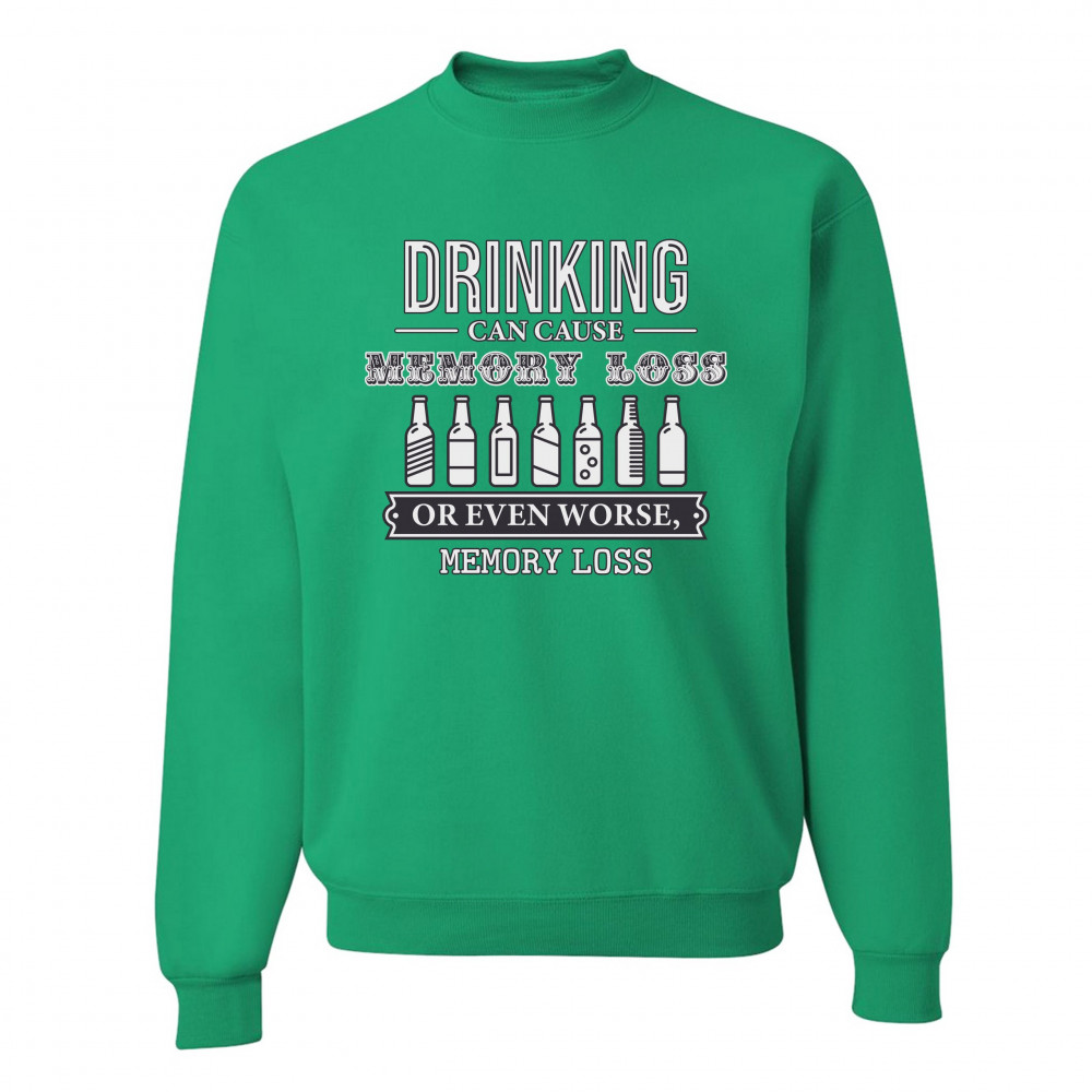 DRINKING CAN CAUSE MEMORY LOSS sweatshirt alcohol beer inappropriate crewneck green