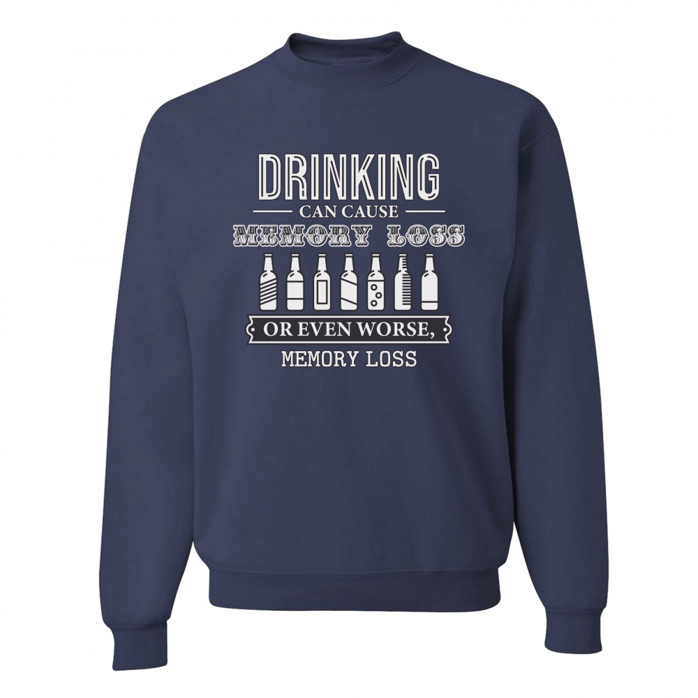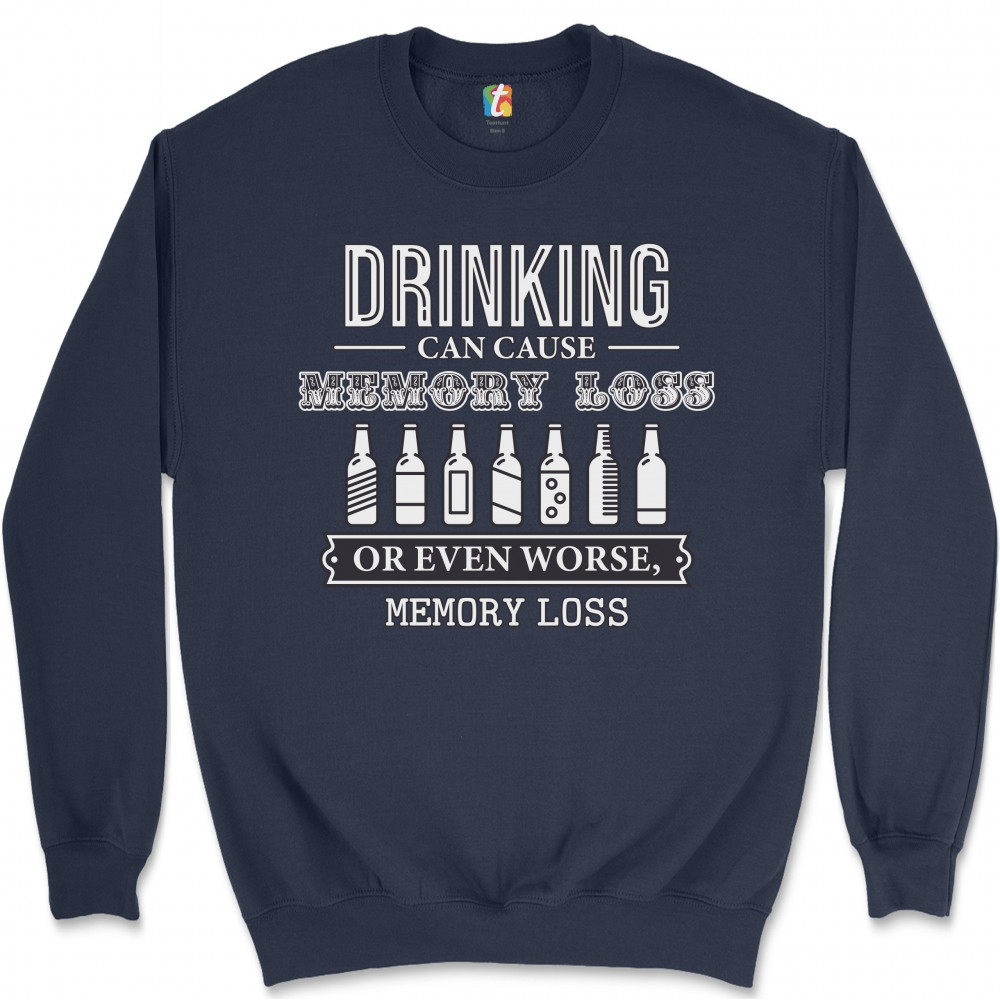 DRINKING CAN CAUSE MEMORY LOSS sweatshirt alcohol beer inappropriate crewneck navy blue