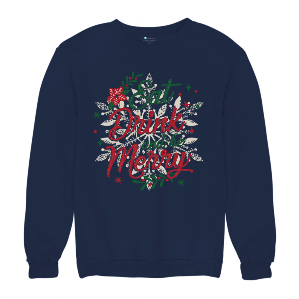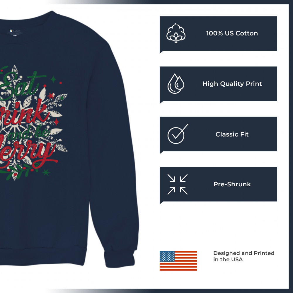 Bring the joy of the season with this "Eat, Drink, and Be Merry" design, crafted to make every holiday gathering a bit brighter. Ideal for cozy holiday mornings, family gatherings, Secret Santa gifts, or festive office parties, this piece captures the spirit of Christmas. Perfect for matching group sets or as a thoughtful holiday present, it’s designed in classic Christmas colors to complement the festive atmosphere. Let this design bring warmth and joy to your celebrations!