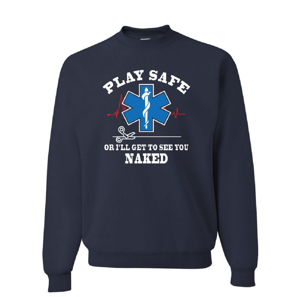 EMS PLAY SAFE OR I'LL GET TO SEE YOU NAKED sweatshirt paramedic sweater navy blue