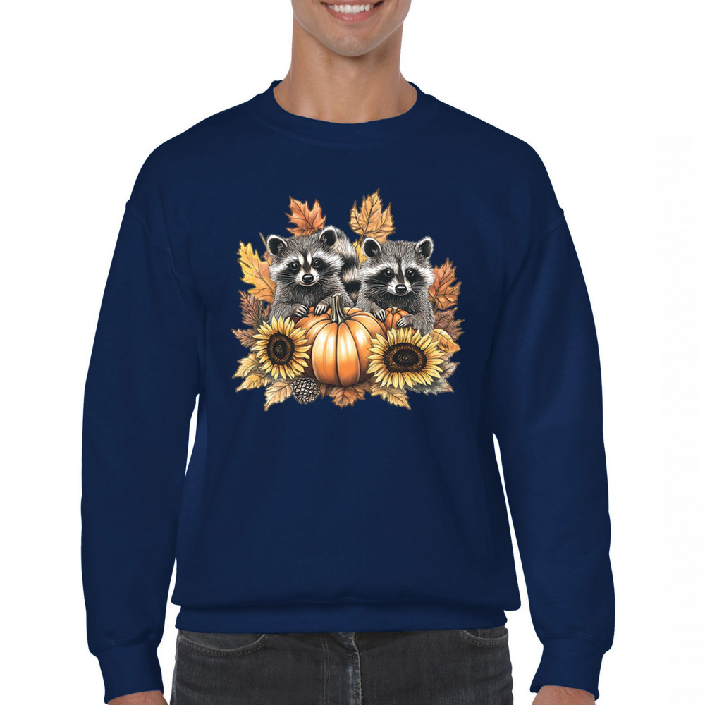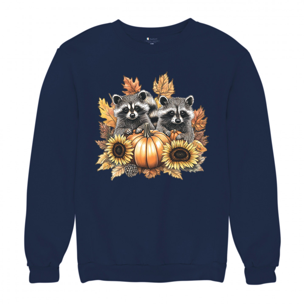 Rustic autumn raccoon design with pumpkins and sunflowers. Perfect for Thanksgiving, pumpkin patch days, farmhouse harvest, and woodland fall fashion.