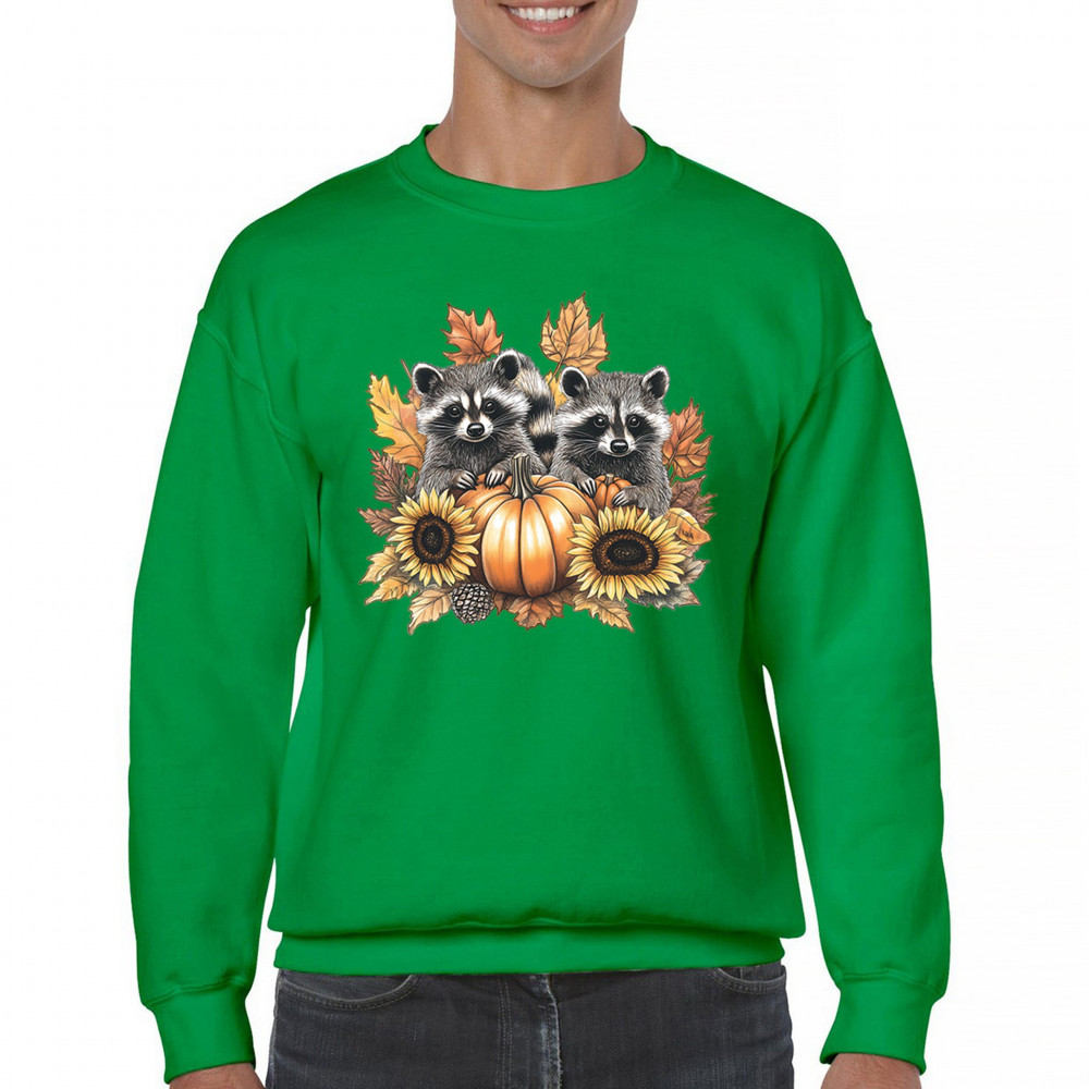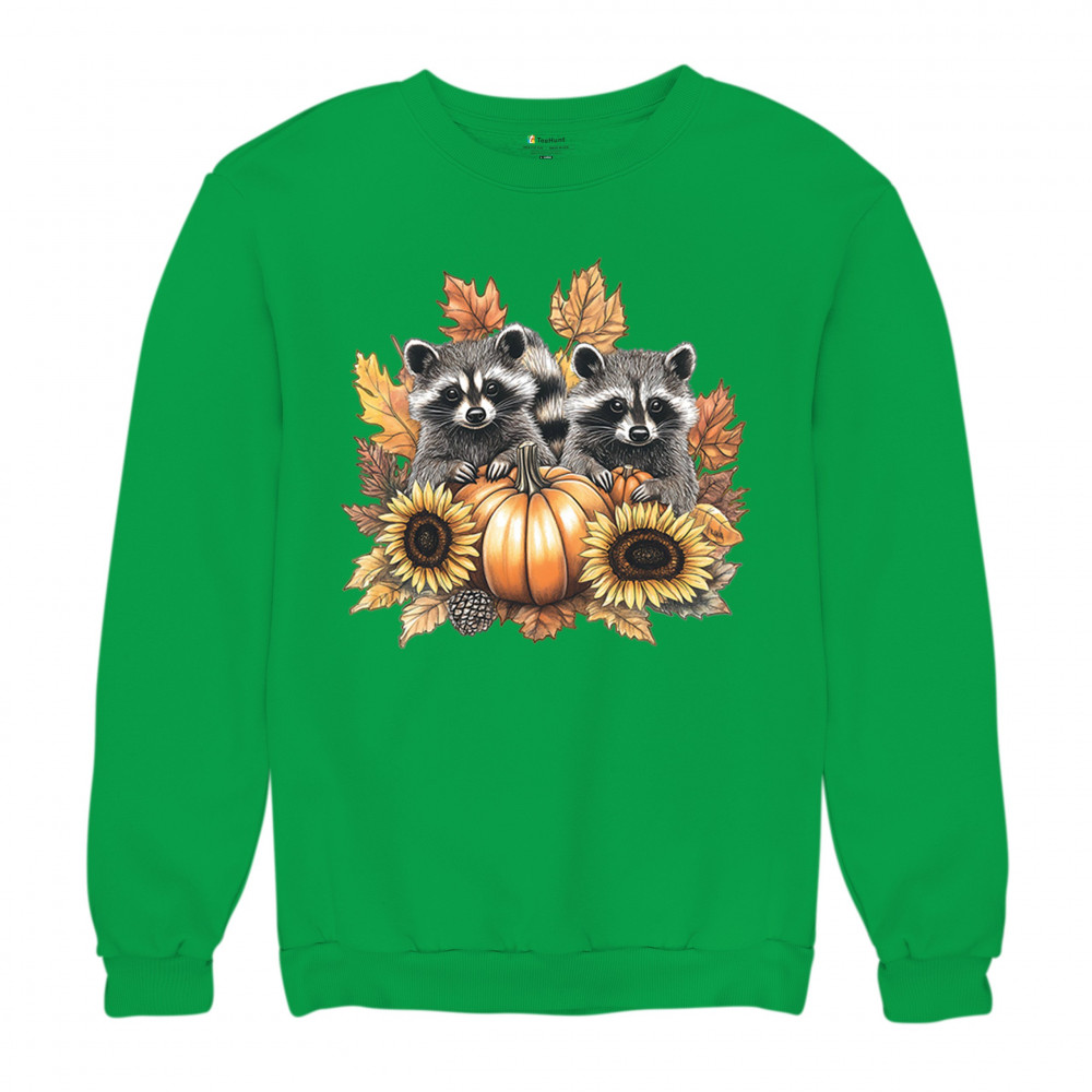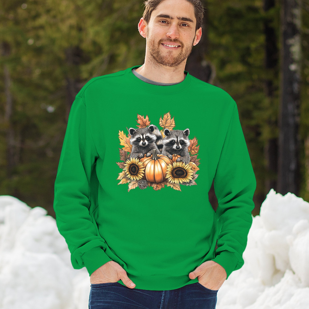 Rustic autumn raccoon design with pumpkins and sunflowers. Perfect for Thanksgiving, pumpkin patch days, farmhouse harvest, and woodland fall fashion.