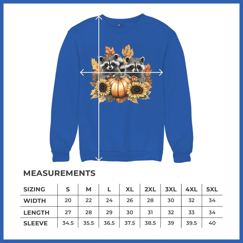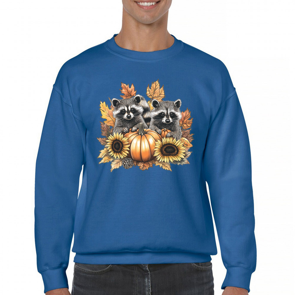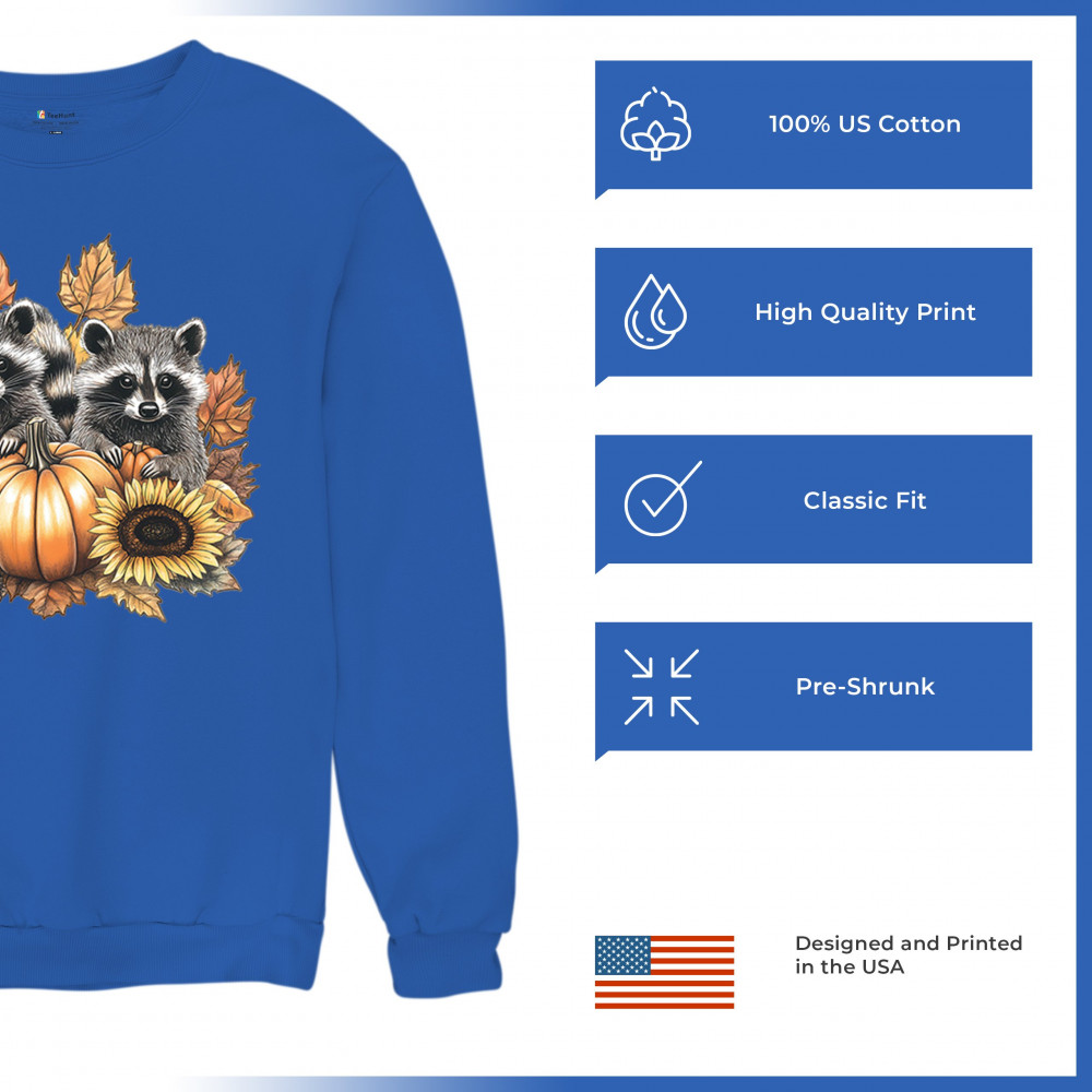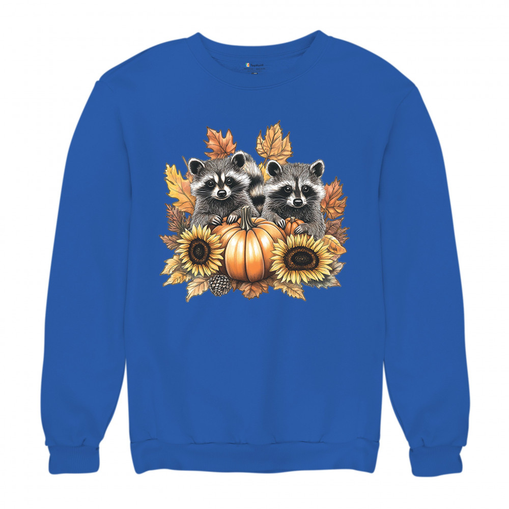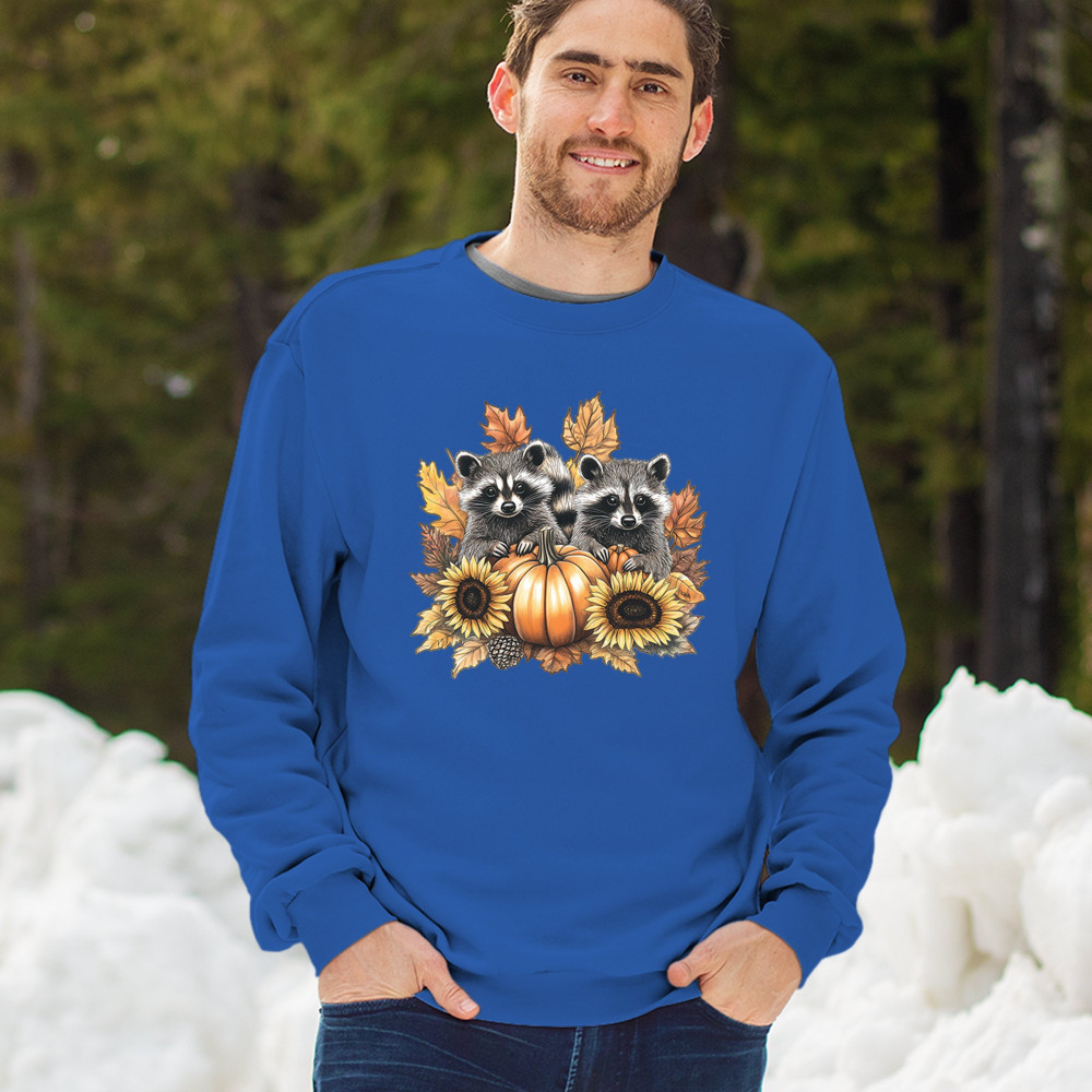 Rustic autumn raccoon design with pumpkins and sunflowers. Perfect for Thanksgiving, pumpkin patch days, farmhouse harvest, and woodland fall fashion.