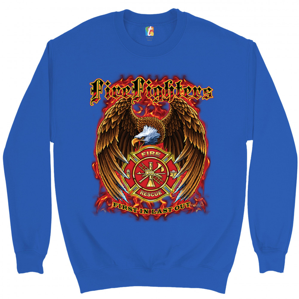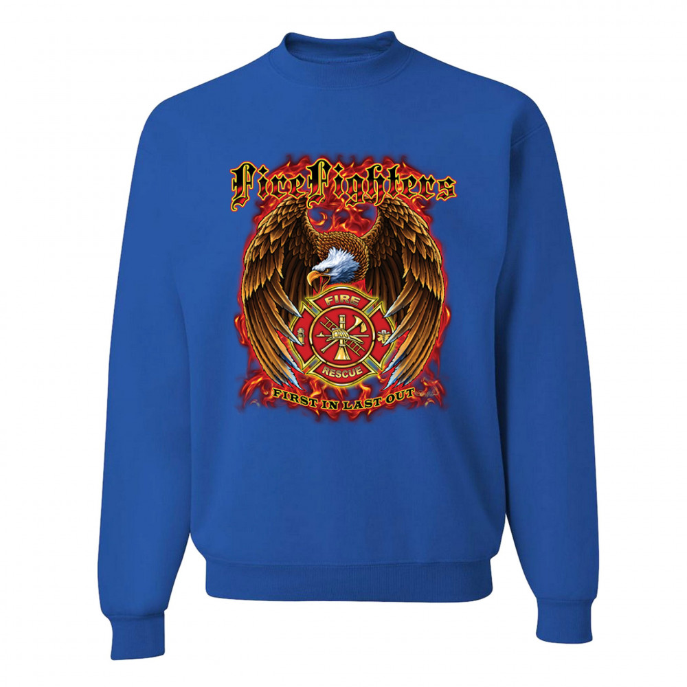 FIREFIGHTERS FIRST IN LAST OUT sweatshirt fire and rescue bald eagle crewneck royal blue