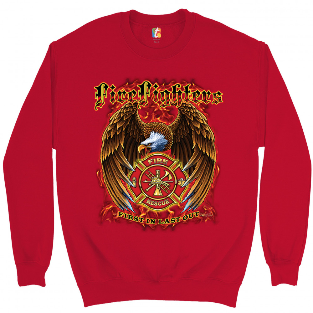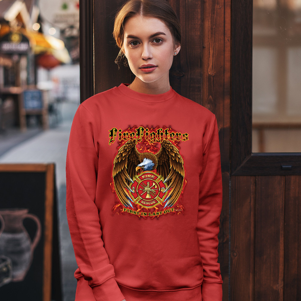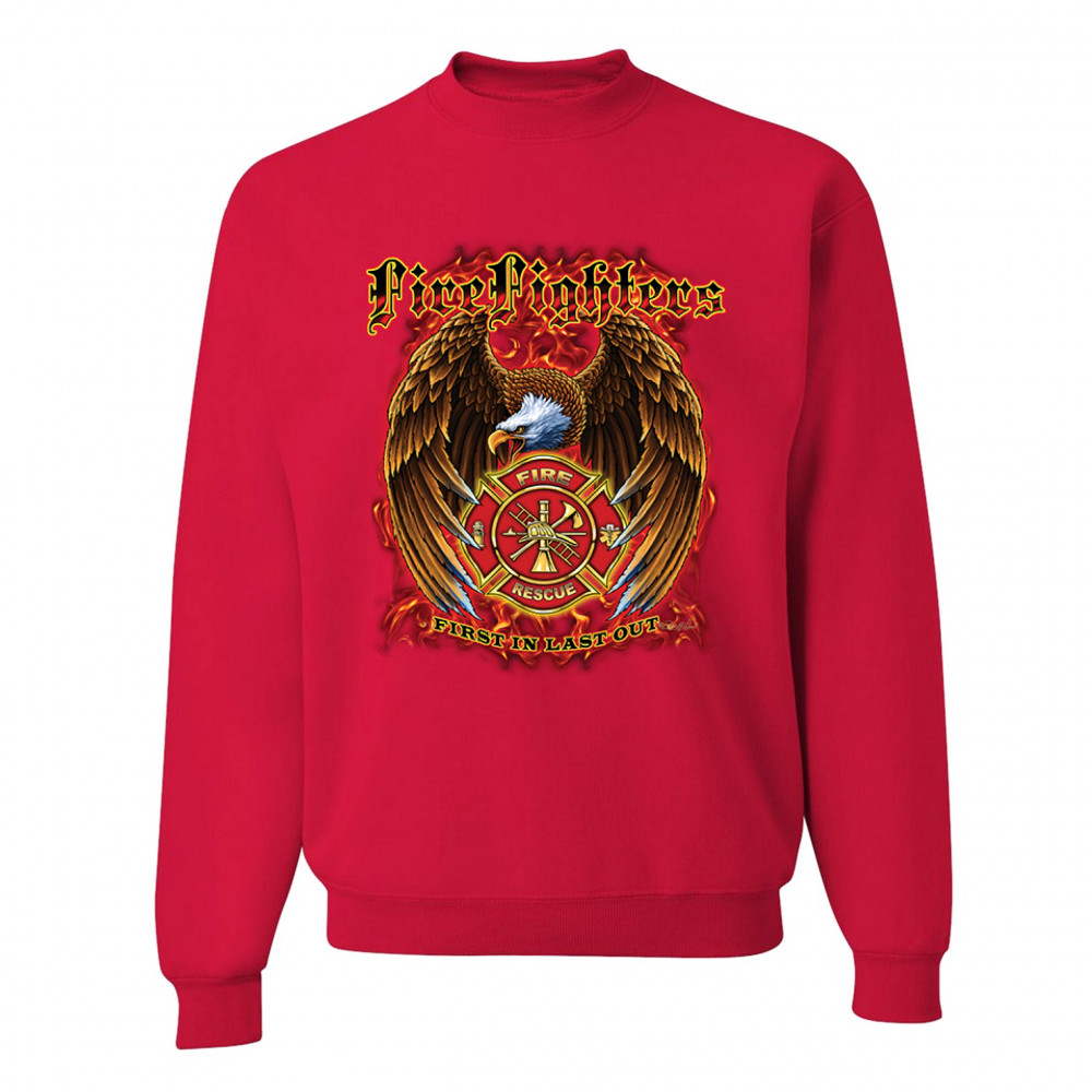 FIREFIGHTERS FIRST IN LAST OUT sweatshirt fire and rescue bald eagle crewneck red