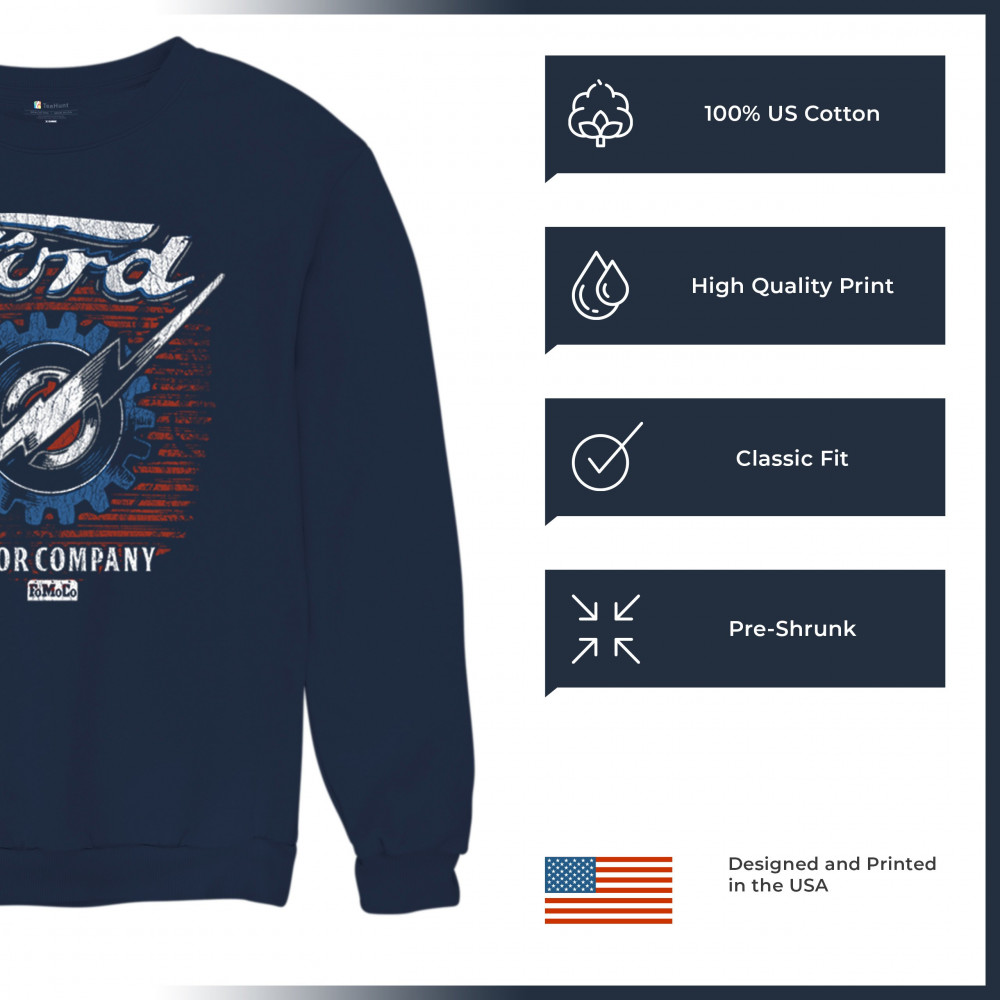 Honor Ford Motor Company’s legacy with this officially licensed vintage design, featuring a lightning bolt, distressed flag, and FoMoCo heritage.