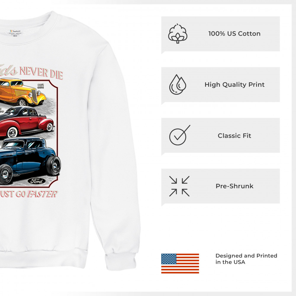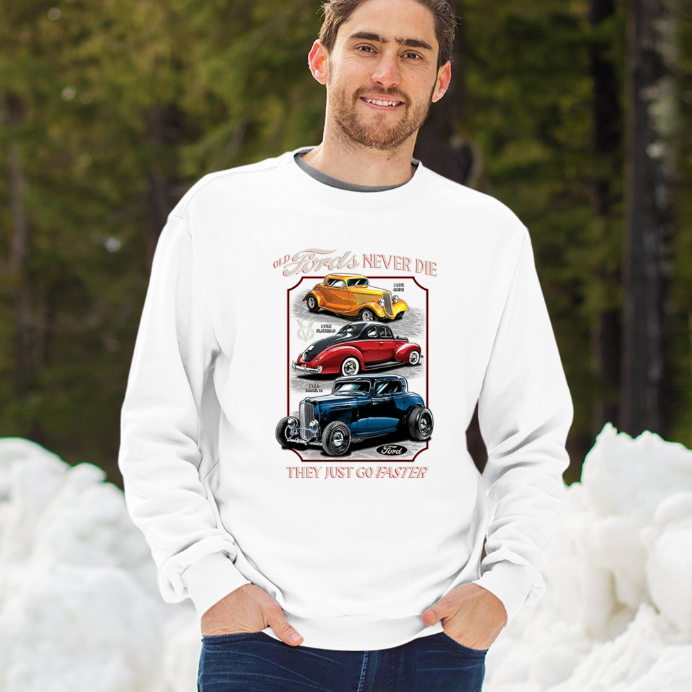 This retro design features three legendary Ford hot rods from the 1930s and 1940s, boldly rendered in a tribute to American street rod history. Ideal for muscle car lovers, vintage performance fans, and classic car culture enthusiasts who appreciate timeless speed. A must-have for cruise nights, garage hangs, and car shows.