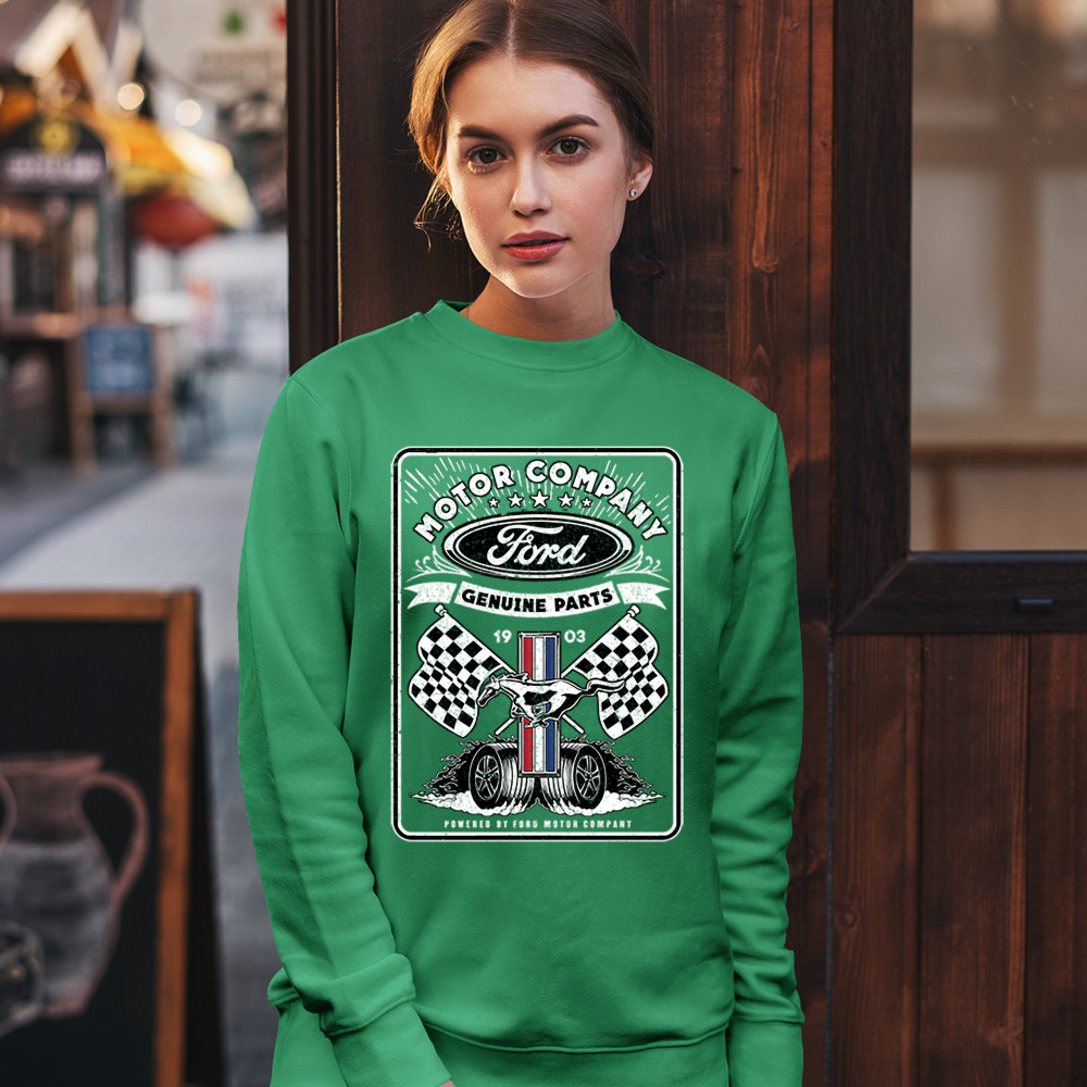 A print featuring Ford logo in the top, Mustang logo in the center, two racing flags and two rolling wheels. The prints says: "Ford Motor Company Genuine Parts 1903" in the top and "Powered by Ford Motor Company" in the bottom. A great choice for anyone w