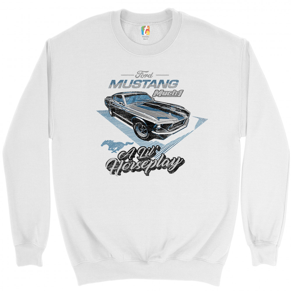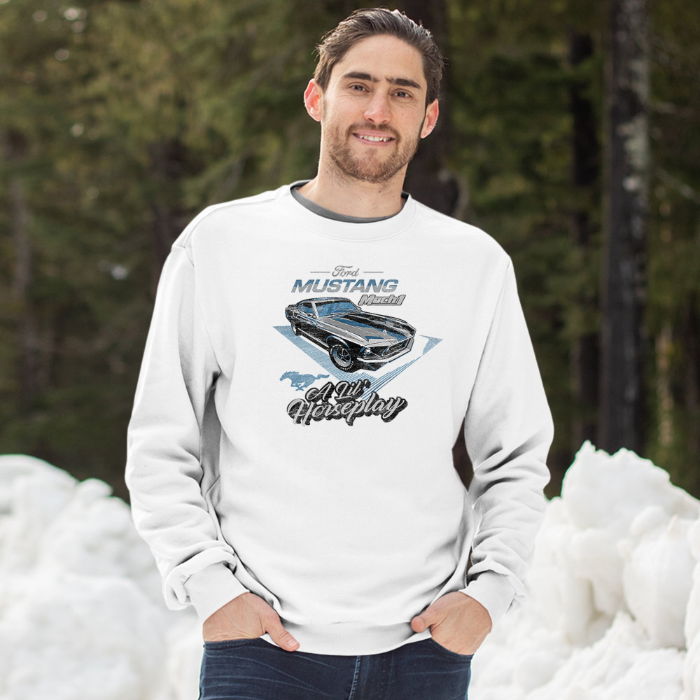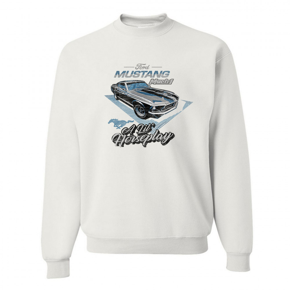 FORD MUSTANG MACH 1 A LIL' HORSEPLAY sweatshirt muscle car licensed crewneck white