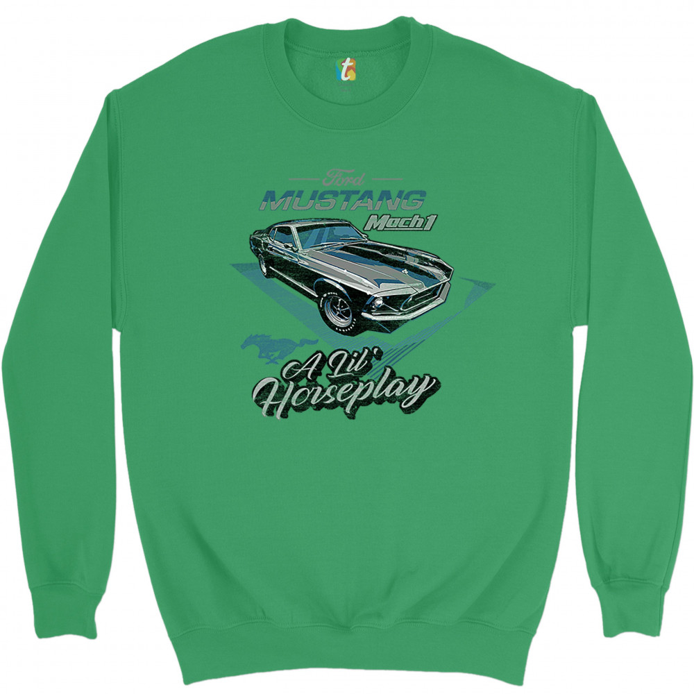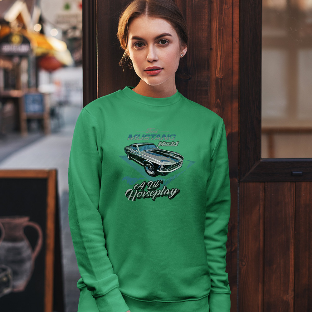 FORD MUSTANG MACH 1 A LIL' HORSEPLAY sweatshirt muscle car licensed crewneck green