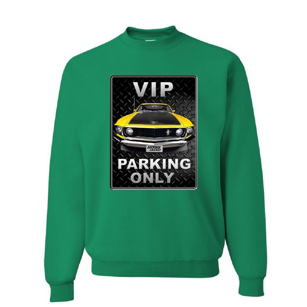 VIP PARKING ONLY ford mustang sweatshirt yellow boss 302 muscle car sweater green