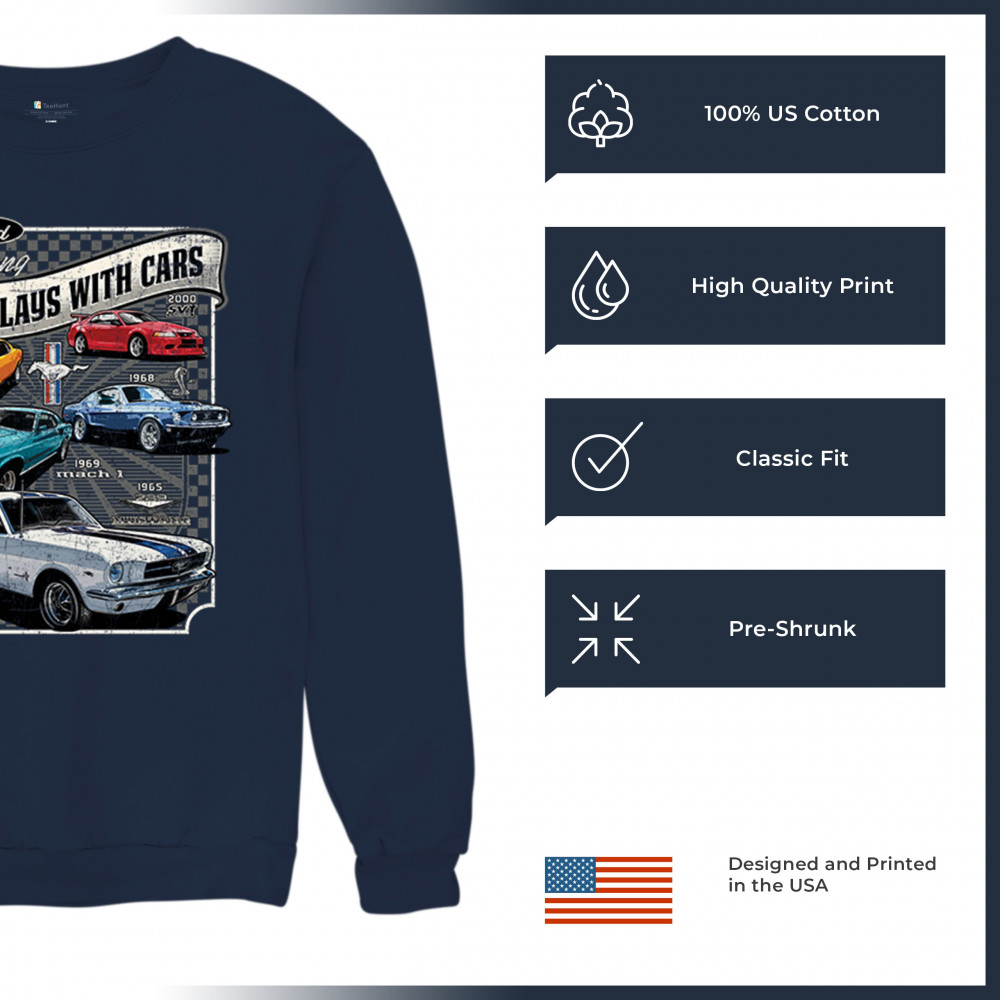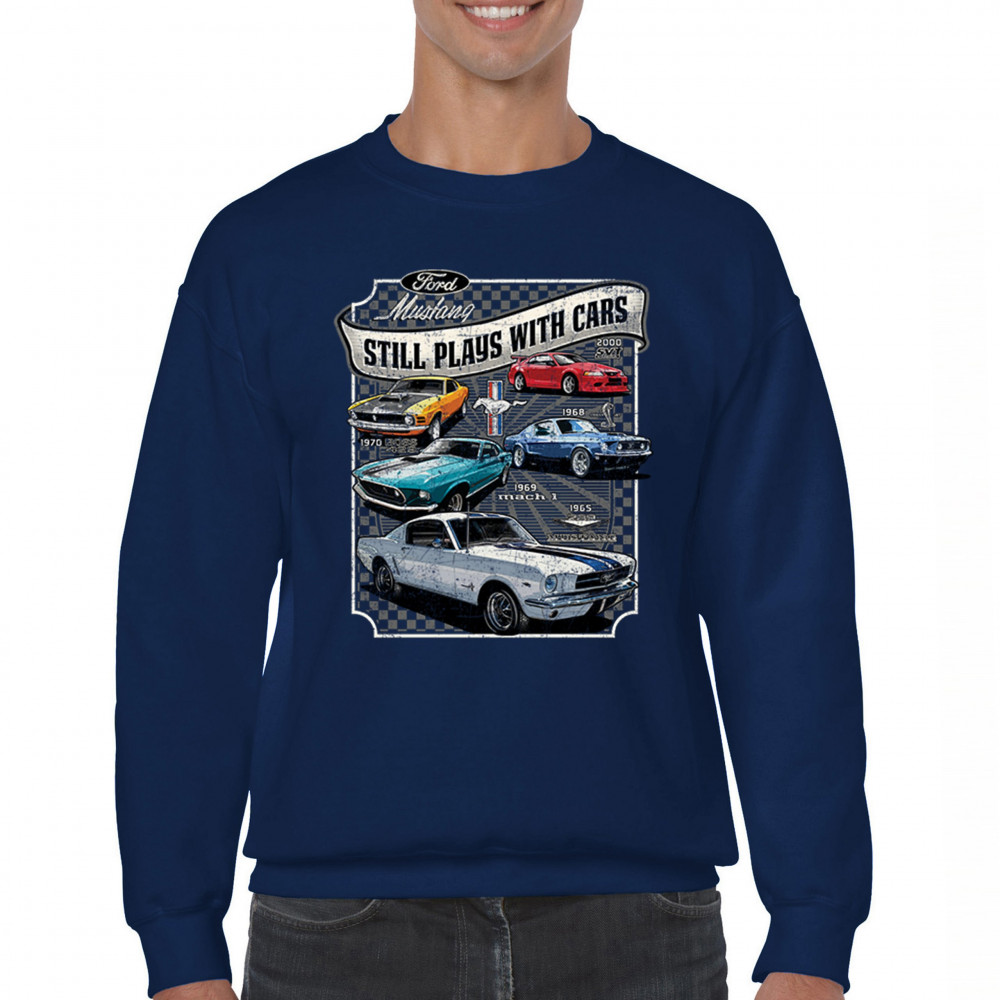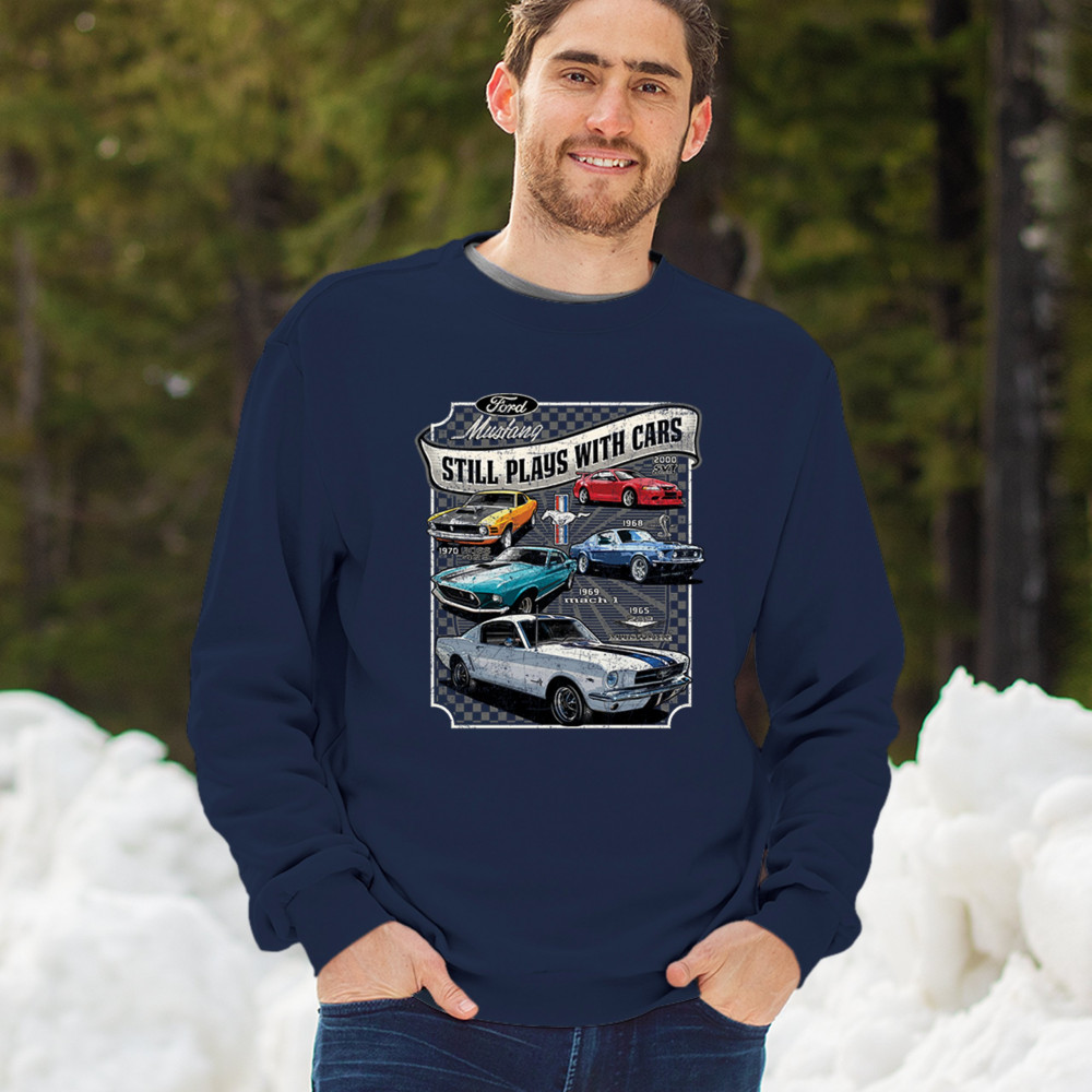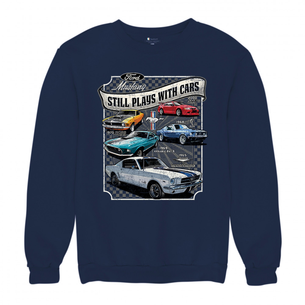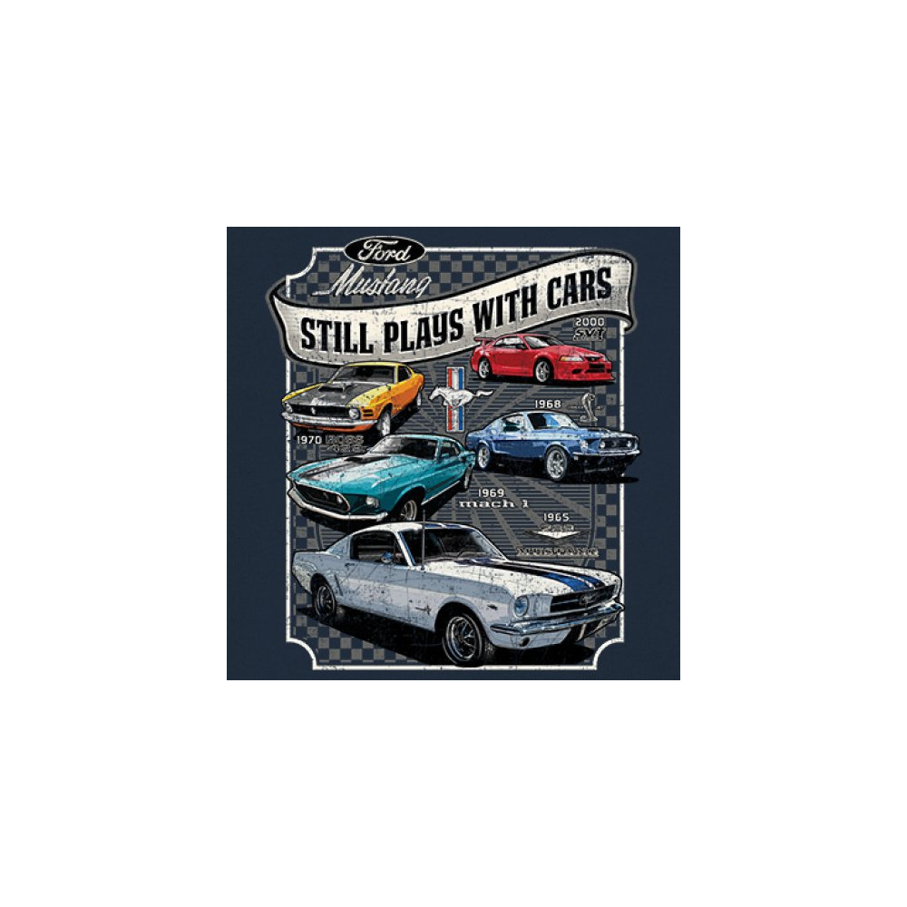 This bold Ford Mustang "Still Plays With Cars" design showcases six classic models from 1965 to 2000, including the 1969 Mach 1, 1970 Boss 302, and 2000 SVT. A dream graphic for muscle car lovers, collectors, and pony car fans. Great for classic auto shows, retro cruises, garage wear, or car clubs.