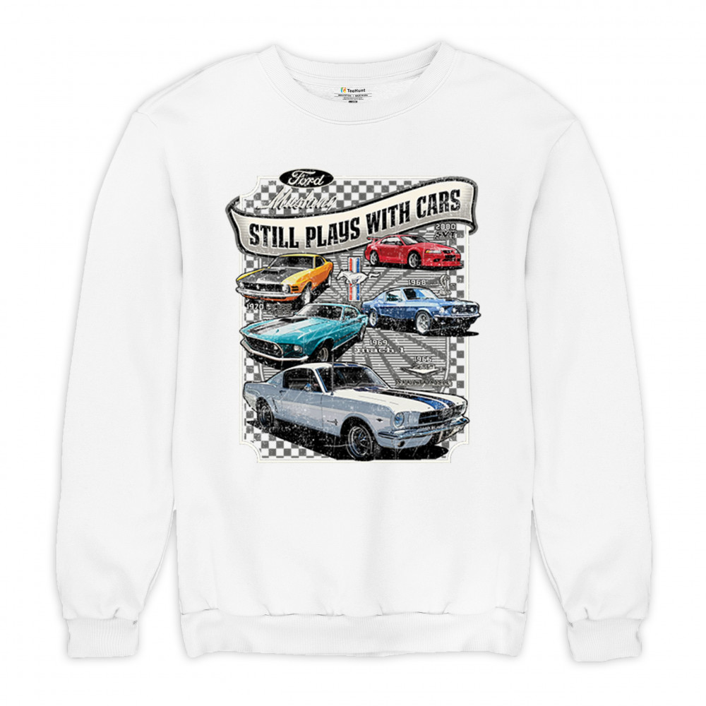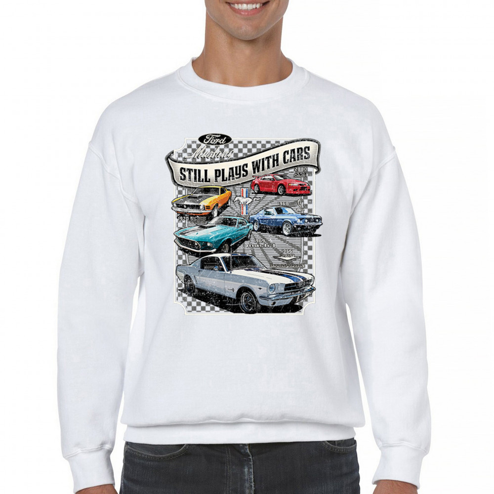 This bold Ford Mustang "Still Plays With Cars" design showcases six classic models from 1965 to 2000, including the 1969 Mach 1, 1970 Boss 302, and 2000 SVT. A dream graphic for muscle car lovers, collectors, and pony car fans. Great for classic auto shows, retro cruises, garage wear, or car clubs.