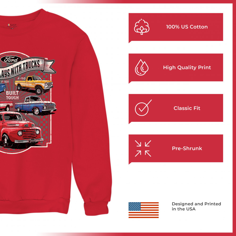 Features classic Ford F-Series trucks from 1949 to F-150. Great for vintage truck fans, garage wear, car shows, and collectors who love pickups.