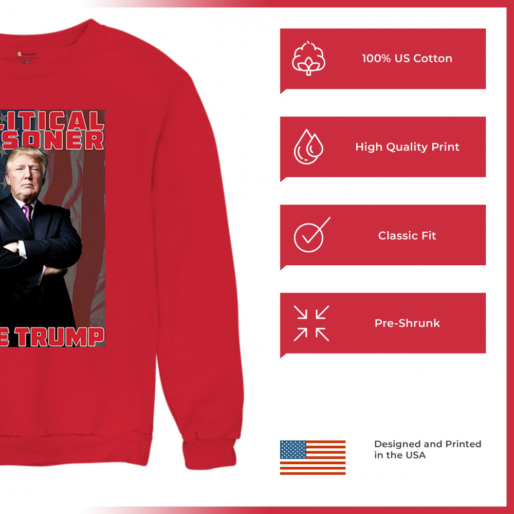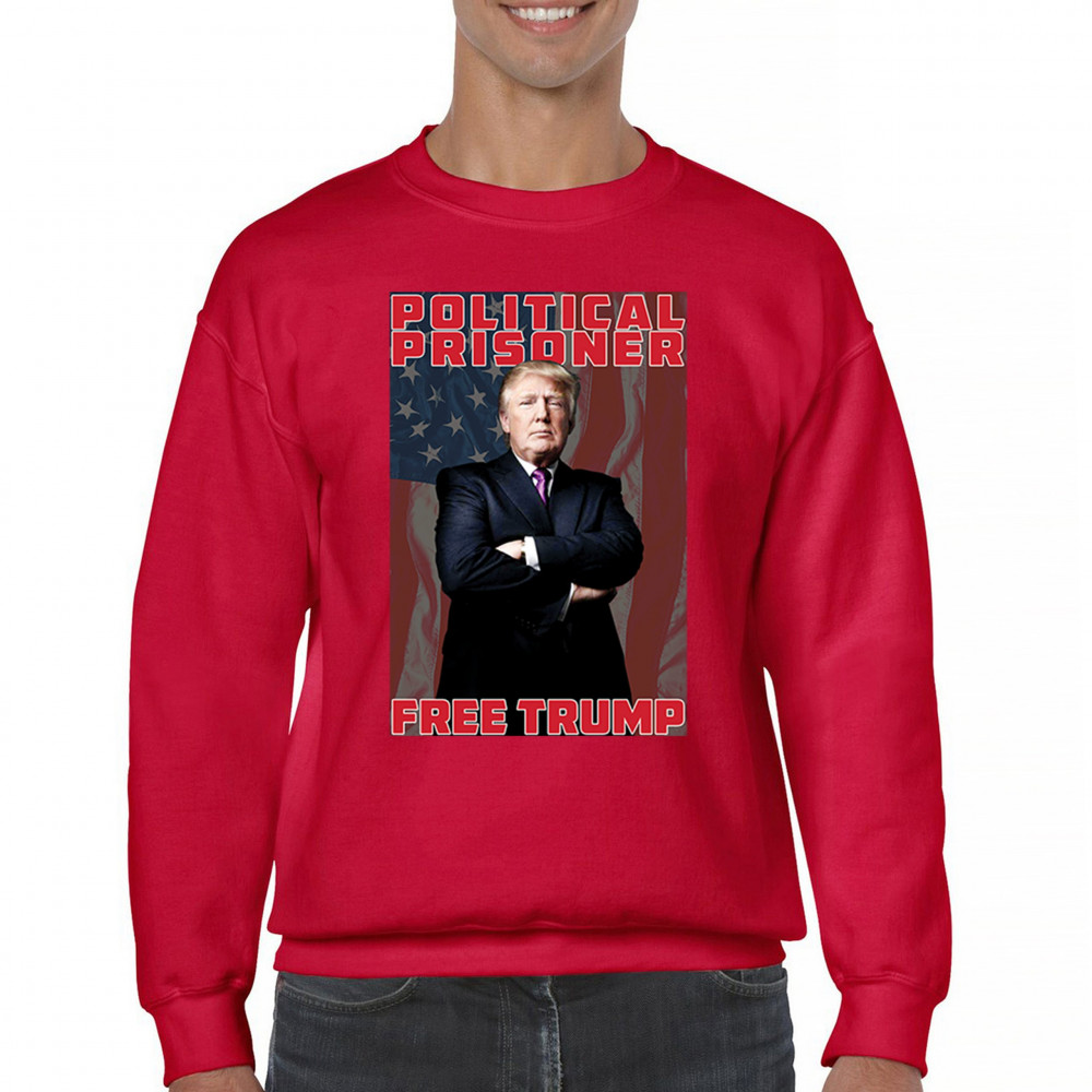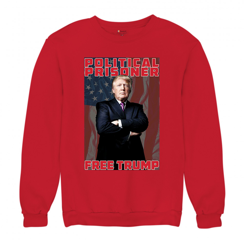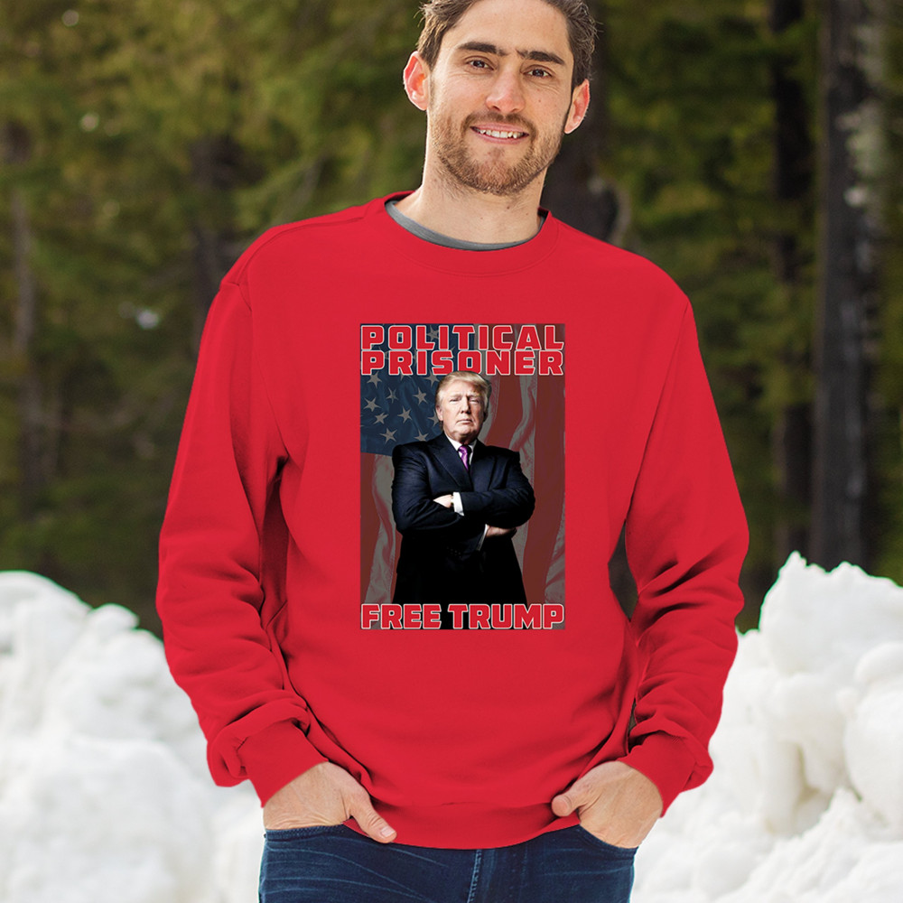 Show your support with the "Political Prisoner Free Trump" design, featuring Trump against an American flag. Perfect for conservative patriots and Trump supporters.