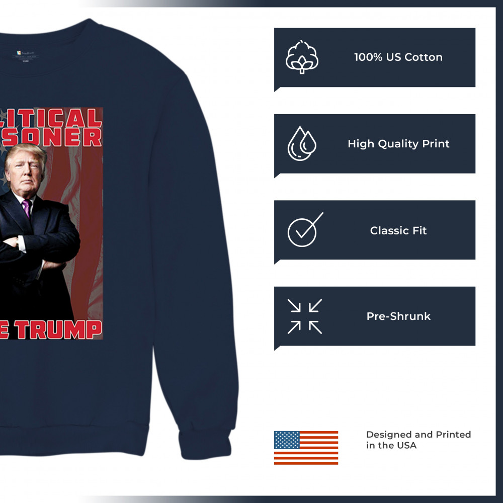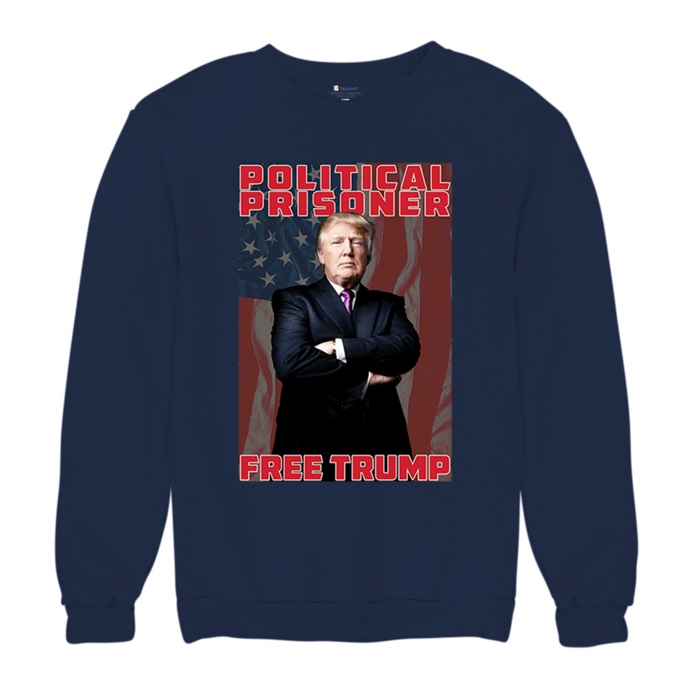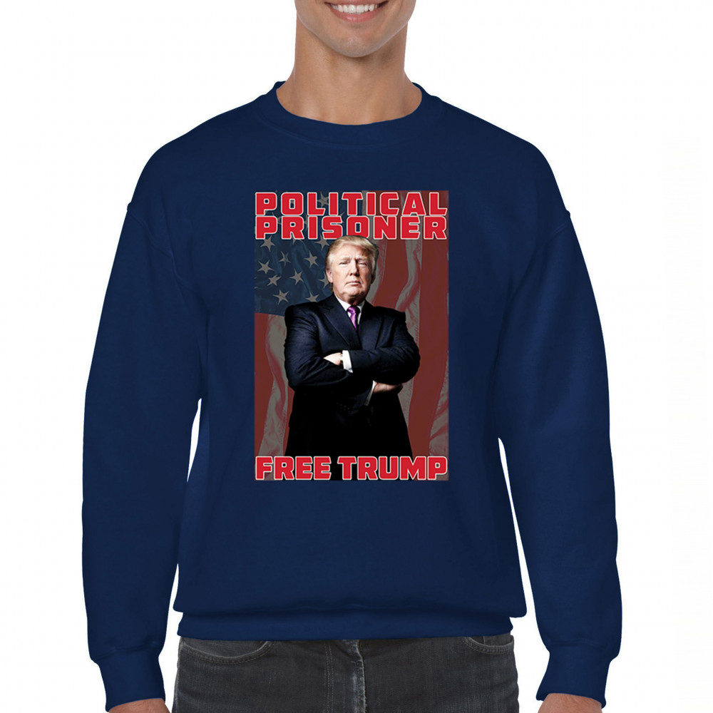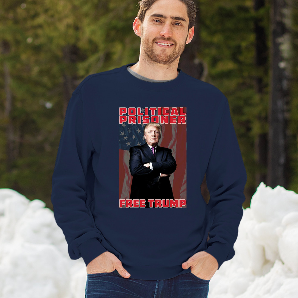 Show your support with the "Political Prisoner Free Trump" design, featuring Trump against an American flag. Perfect for conservative patriots and Trump supporters.
